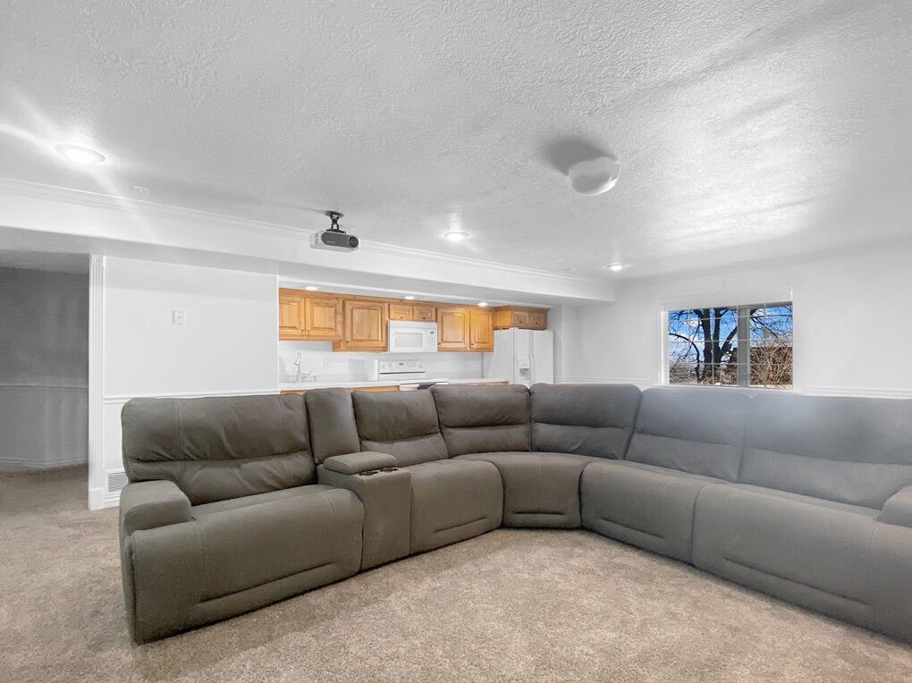 Downstairs: 3 bedrooms and one full bathroom. Another complete kitchen. The basement has its own walk out entrance with a gate/ steps around the house to offer private entrance. Large living room with projector setup. Storage and utility rooms. Small washing machine