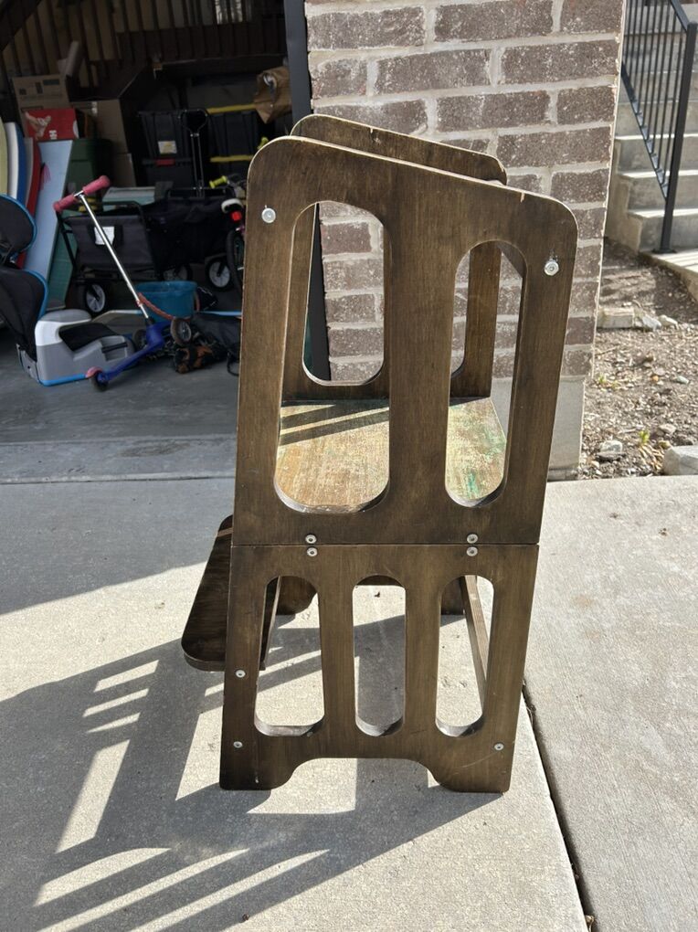 ApplePayHis toddler tower is well loved! It has a hook on the side for safety when it’s folded up. I can fold into a desk or back into a toddler tower.