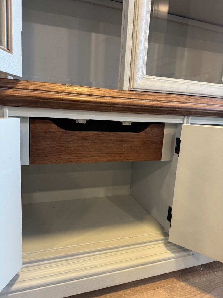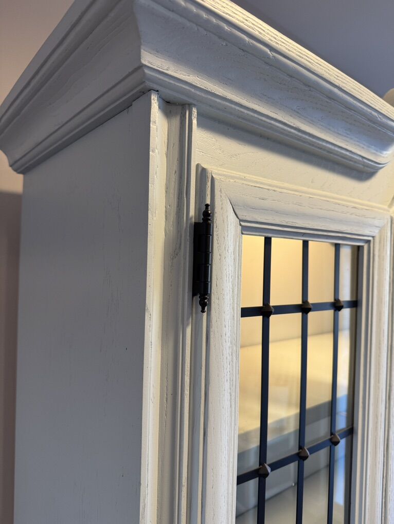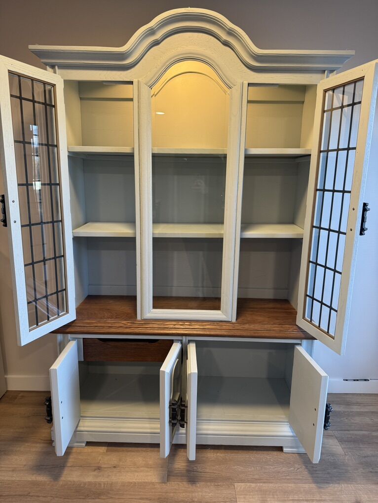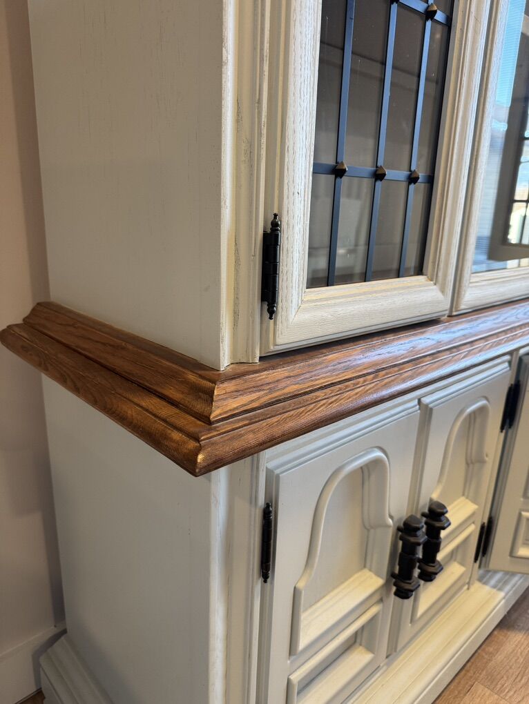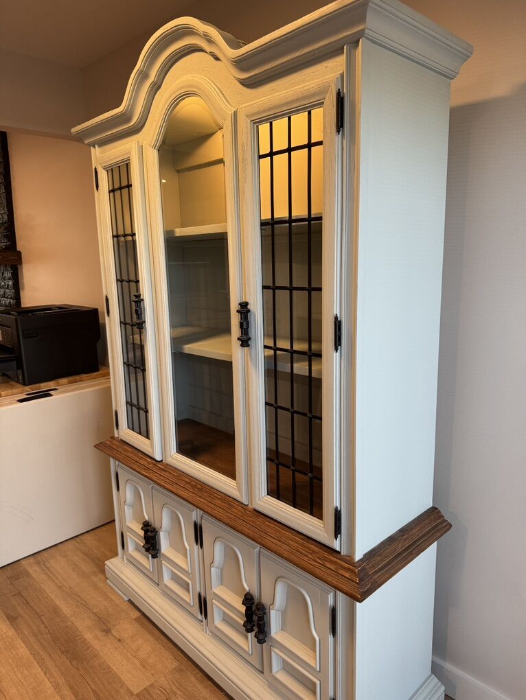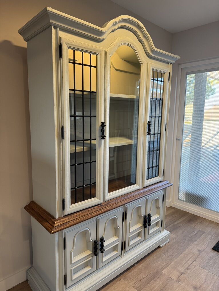 VenmoBeautifully and professionally refinished china cabinet. This piece was restored and updated with simple stained wood details that make it truly a unique piece. Cabinet was fully stripped to bare wood, with new shellac primer and alkyd urethane finishes and top coats in a 4 coat system. Details were all recarved by hand. Shelves were replaced with solid white oak and new back panels installed. All hardware is original and refinished. Comparable pieces on Etsy sell in the $3,800 range on average.