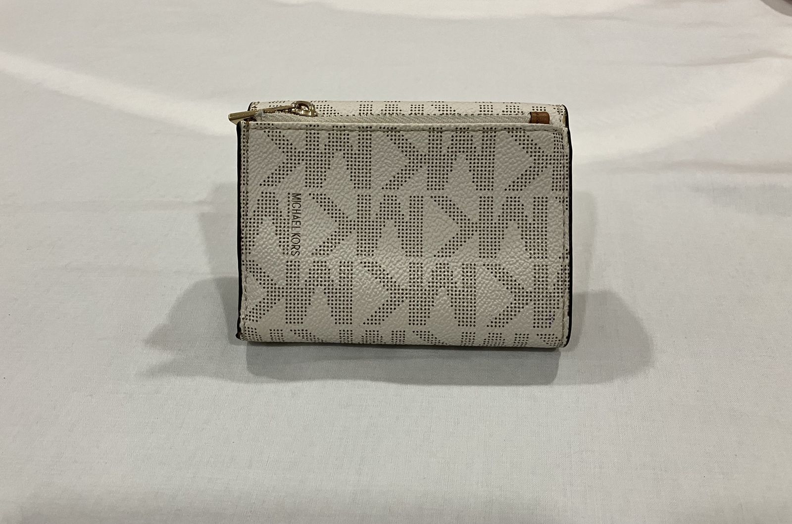 Cute Michael Kors Ladies Wallet. Color in Vanilla, with a logo print canvas. Size:4.25"W x 3.25"H x 1.5"D., Exterior details: It has gold-tone hardware, snap fastening, coin zipper pocket. Interior details: Back and front slip pockets, 4 card slots, ID window. It's made from coated canvas, polyester and polyurethane. (Cash Only)