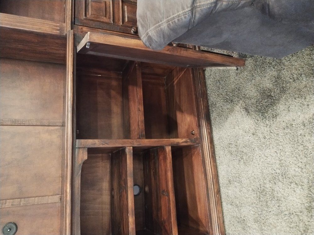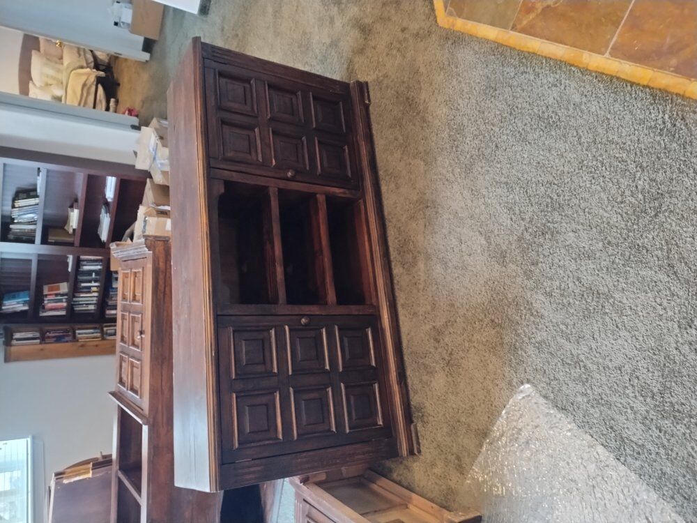 10' wide, 90 1/4" tall, 14 1/2 deep (side bookshelves) & 18" deep (center). Bottom right cupboard had the back cut out for water main access. Comes apart to transport and install in place. Separated center lower piece pictured to depict piece sizes.