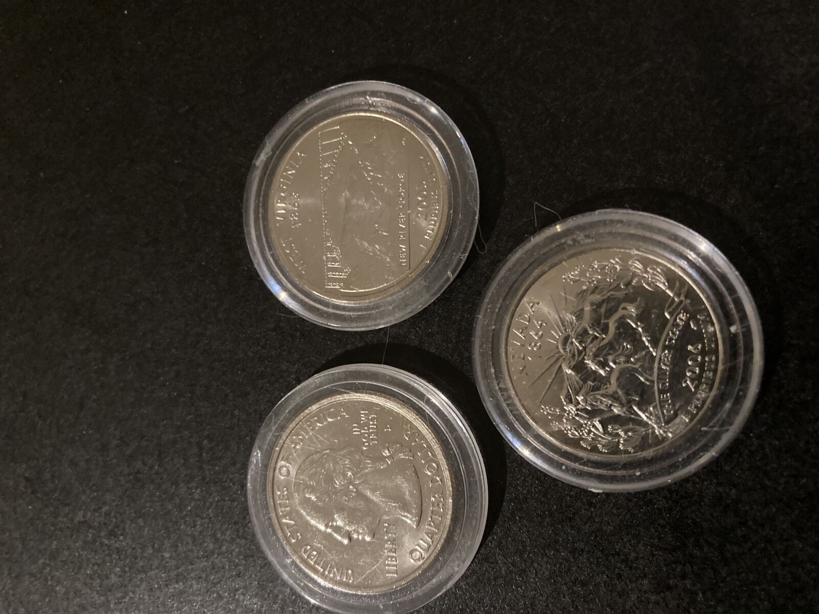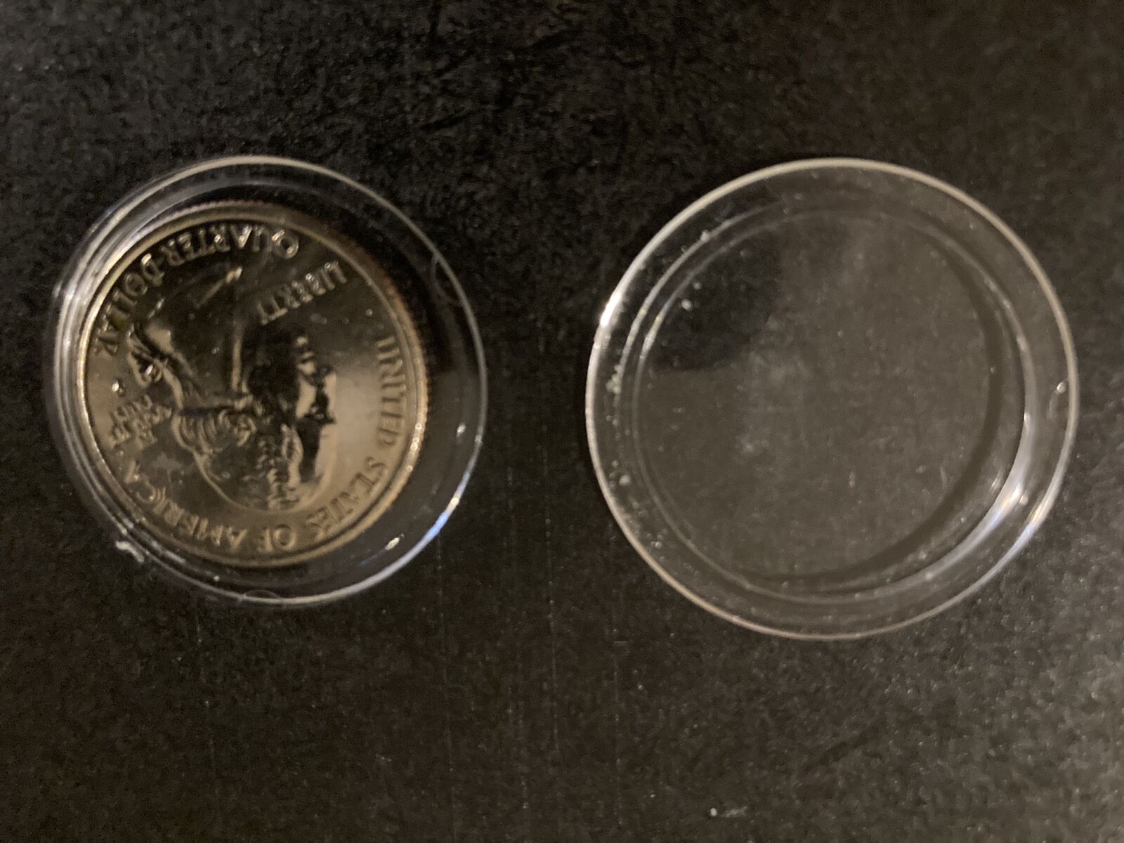 Elegant display of fifty one uncirculated United States quarter dollar coins, one for each state of the union plus one more to illustrate the common obverse design (George Washington in profile).