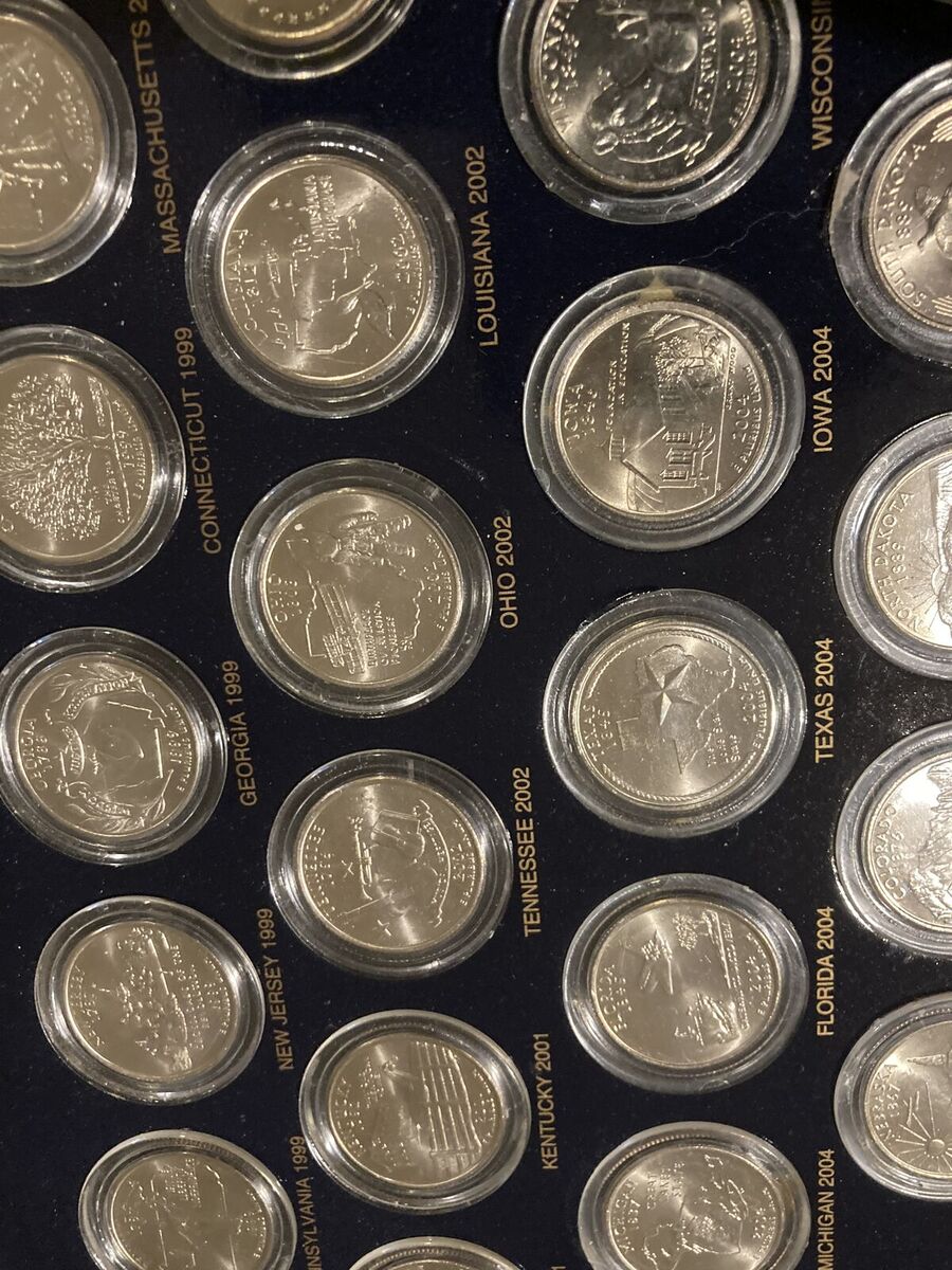 These coins were produced by the United States Mint from 1999 to 2008. Each uncirculated coin has a unique reverse designed to celebrate each state's heritage and admittance to the Union. Each coin is in a protective transparent holder. Each removable holder is mounted in Commemorative Gallery's ornately framed display. The frame is solidly built with overall dimensions of 26 x 19 inches.