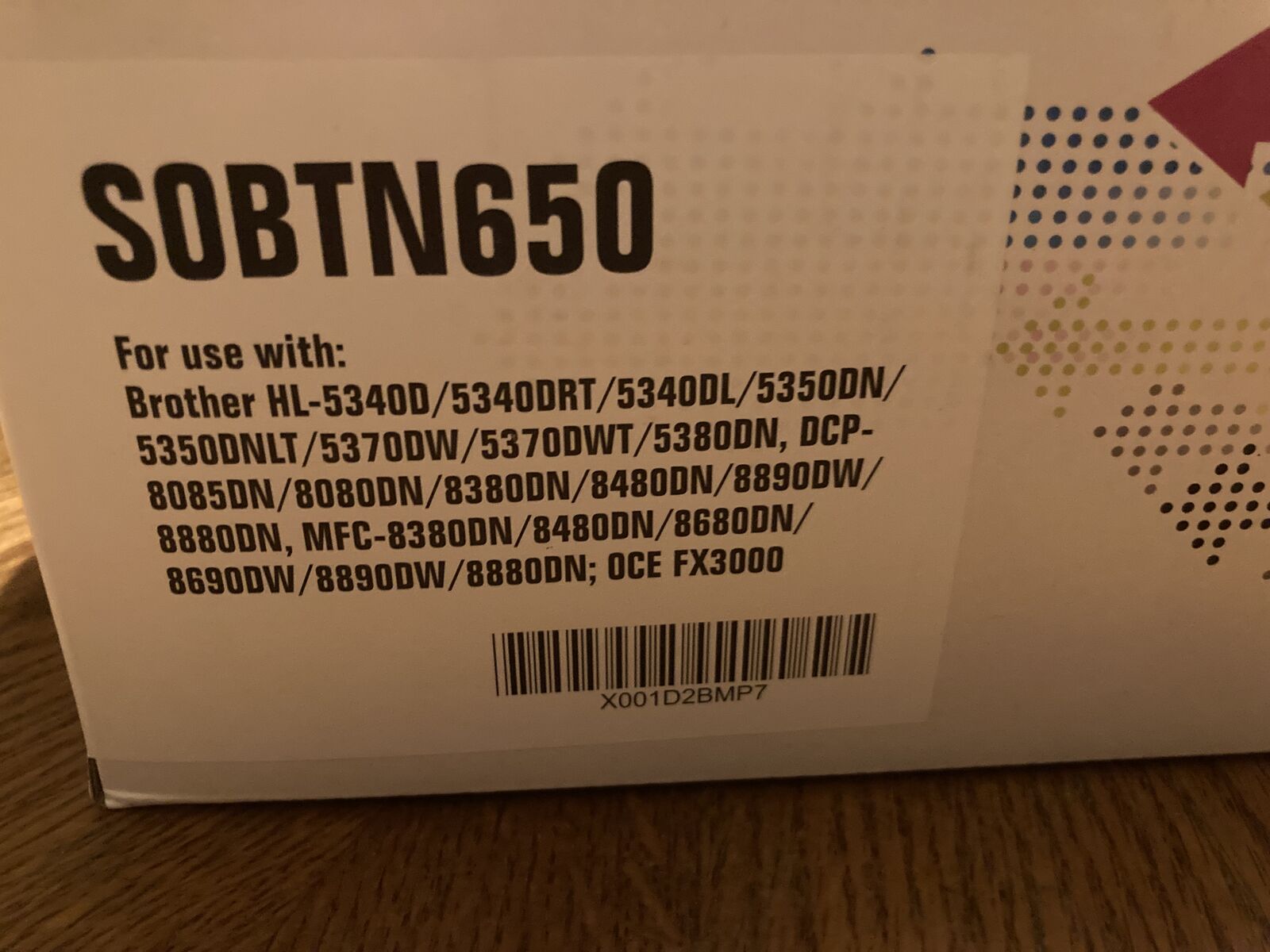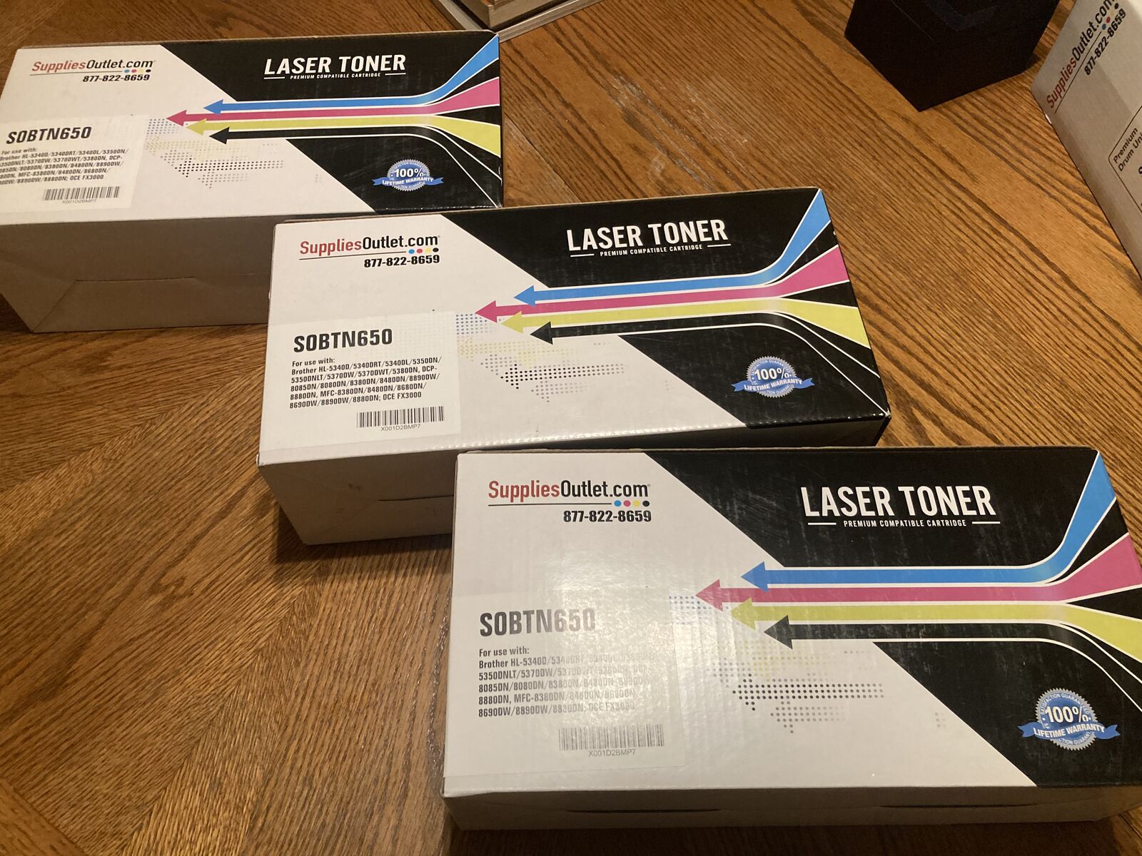 Selling unopened boxes of TN650 black laser toner along with a DR620 Drum Unit. Yield of each toner is 8,000 pages. Brother printer compatibility specs in photos. Asking $25 each or $75 for everything**.** If interested, please call or text Billy at 801-651-9863. Serious inquiries only. Must come pick up at my home in the Trolley Square area of Salt Lake City.