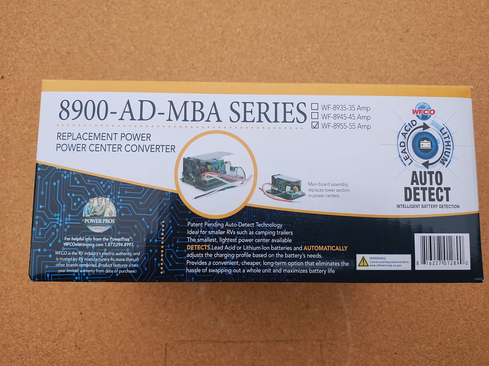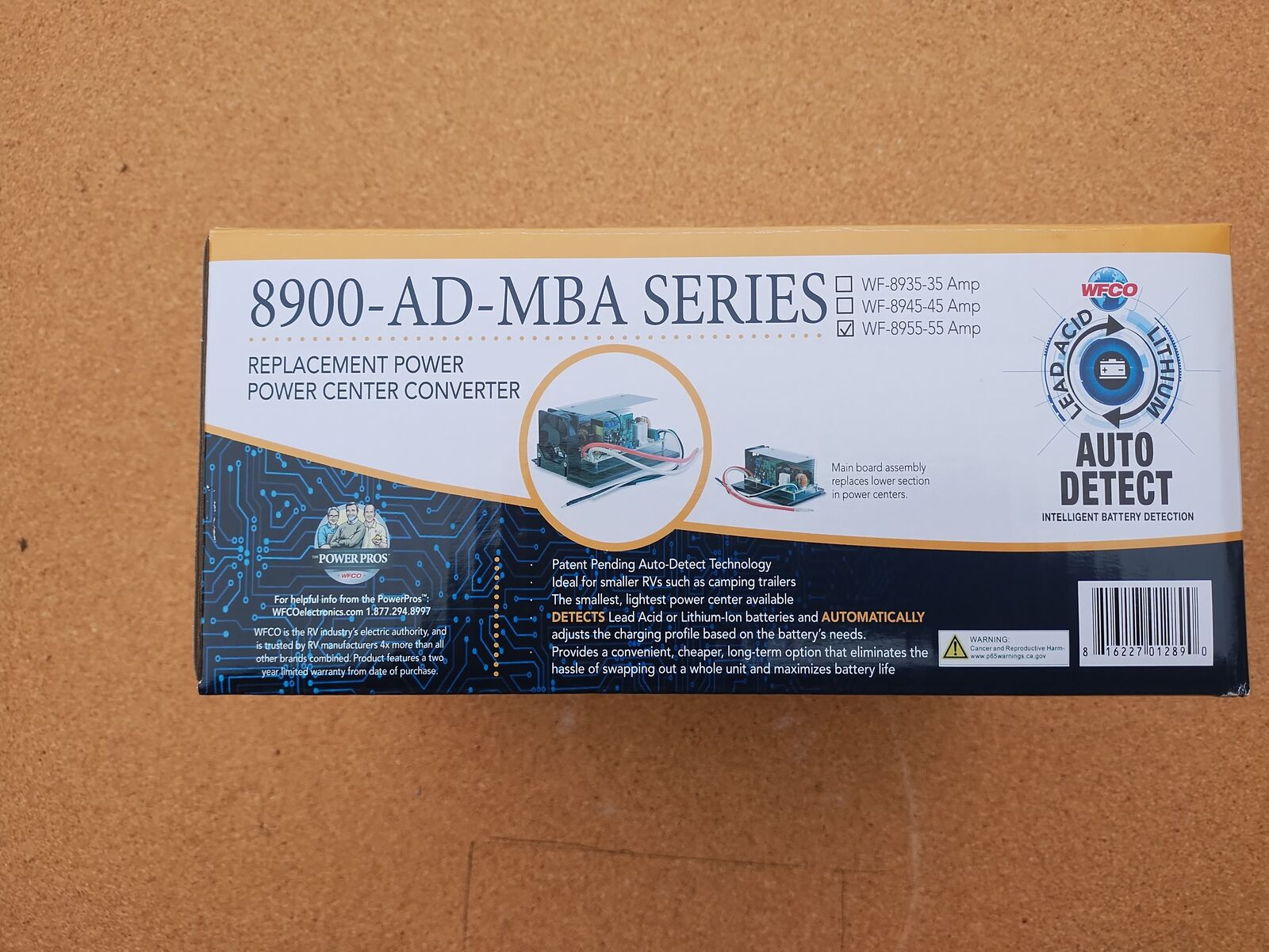 VenmoNEW NEW FOR SALE IN UNOPENED BOX NEW NEW WFCO 8955-Auto Detect Main Board Assembly WORKS WITH LEAD ACID OR LITHIUM This is the time for LITHIUM BATTERY!!!!! WFCO Power center converter AUTO DETECT MAIN BOARD ASSEMBLY This is authentic, direct from factory , WFCO Brand converter BE AWARE there are 3rd party copy cat wanabies out there, I know, I got fooled and ended up with a fake converter. LIST PRICE $363.49 Use link to see more product info: https://www.wfcotech.com/shop/converters/wf-8900-ad-mba-main-board-assembly-series/wf-8955-ad-mba-main-board-assembly/ Specs: Output Power 950 W Input Voltage/Hz _105-130 VAC, 60 Hz_Weight 5 lbs.Dimensions 7 1/16" W x 3 7/8" H x 9 1/2" D Output Current 950 W Converter Type Three-Stage Converter Charger_Voltage Output Lead Acid – 13.2 – 14.4V DC Range, Lithium-Ion – 13.2 – 14.6 VDC, 13.6 – 14.6 VDC_Bulk Mode (Quick Charging Voltage) 14.4V DC (quick charging voltage)Absorption Mode (Nominal Voltage) 13.6V DC (nominal voltage)Float Mode (Trickle Charge Voltage) 13.2V DC (trickle charge voltage) Over Current_Yes Over Temperature_Yes Over Voltage_Yes Reverse Polarity_Yes Cooling System_Yes Mounting Plate Material_Plastic Mounting Plate Color_Black, Brown Certifications_FCC !!!!!!!!! PLEASE DO YOUR DUE DILIGENCE !!!!!! RESEARCH your model that's being replaced!!!!! !!!!!!NO RETURNS!!!! !!!!!!!!! CASH or VENMO !!!!!!!! UTAH COUNTY PICK-UP ONLY