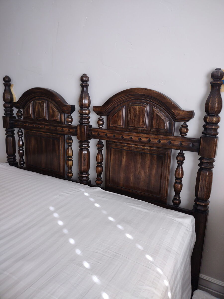 PayPalOf antique vintage set, original hardware a handcrafted 9 drawer two mirror dresser - (two) 2 drawer side tables - Queen headboar(Does not include a frame, box spring, or mattress.) -two lamps. Dresser 70" L X 19" D X 31" H (mirrors are 51" above dresser top) Side tables -15 1/2" D X 25 3/4" W X 23" H-Lamps 30 1/2" H - Queen Headboard (only) 51"H (Dresser finish shows wear in a few places.) $700.00/OBO