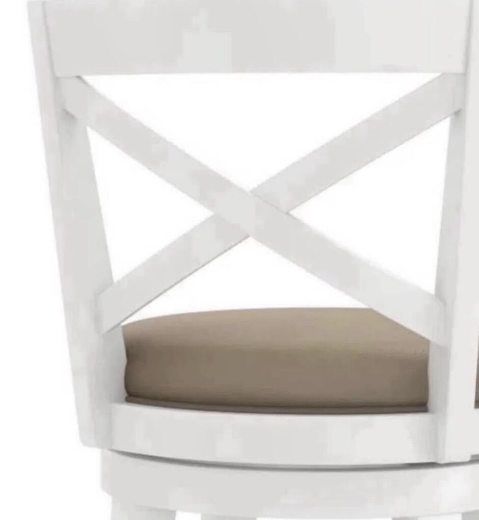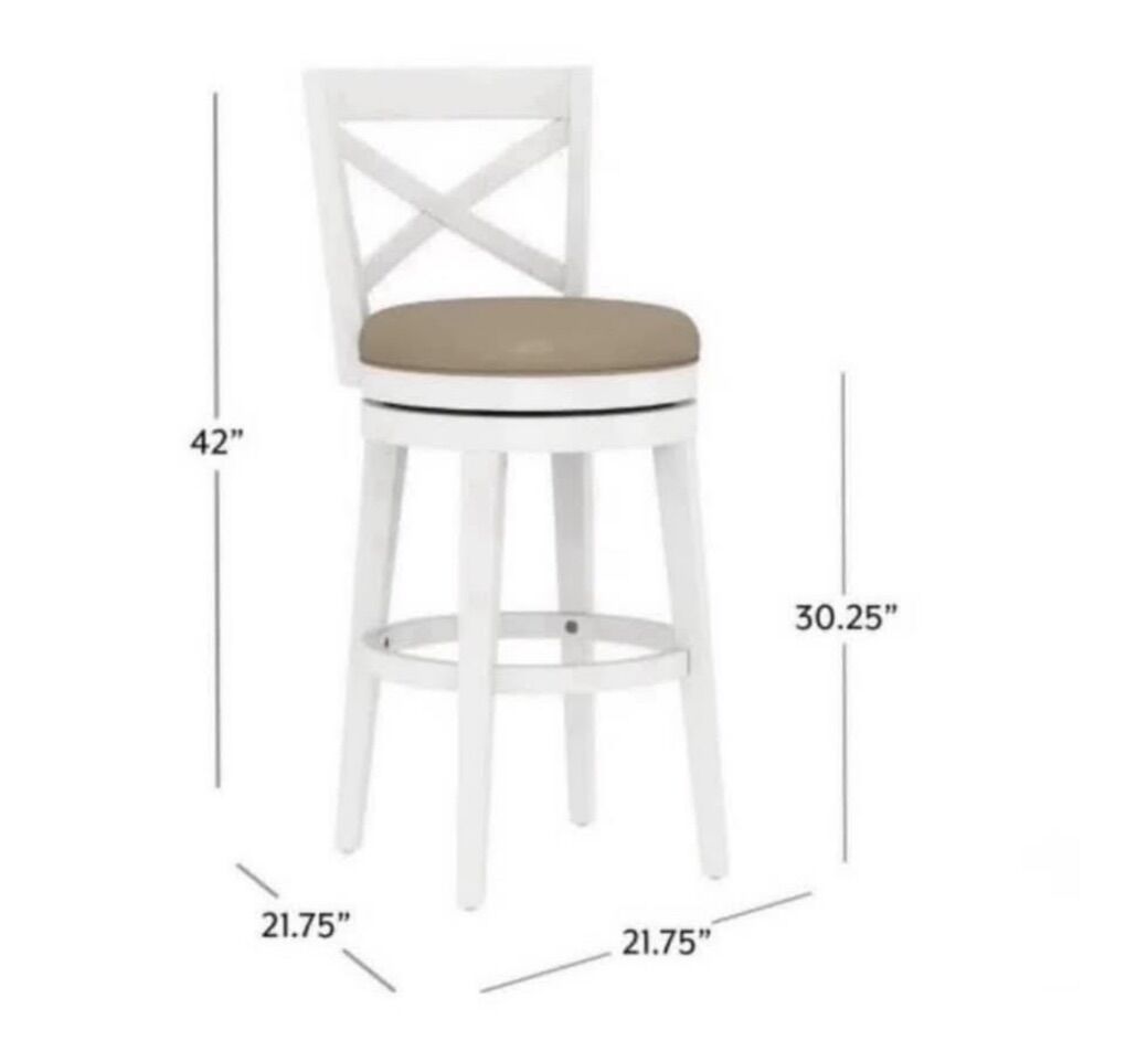 Available in White finish Upholstered in taupe polyurethane Constructed of Rubberwood bentwood 360-Degree Swivel Rustic X-back design Assembly required Recommended weight limit: 250lbs Imported Dimensions & Weight: 21.75” L x 21.75” W x 42” H 27.5 lbs Seat height 30.25” Seat width 18” Seat Back Height 12” Seat Back Width 19” Seat Depth (front to back) 18” General Care: Spot or wipe clean.