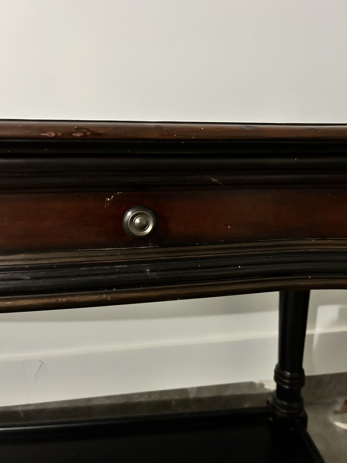 VenmoBlack and dark brown. Some small cosmetic dings, small surface damage on top of end table.