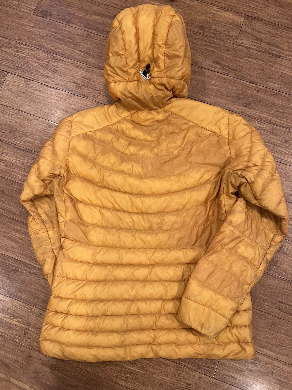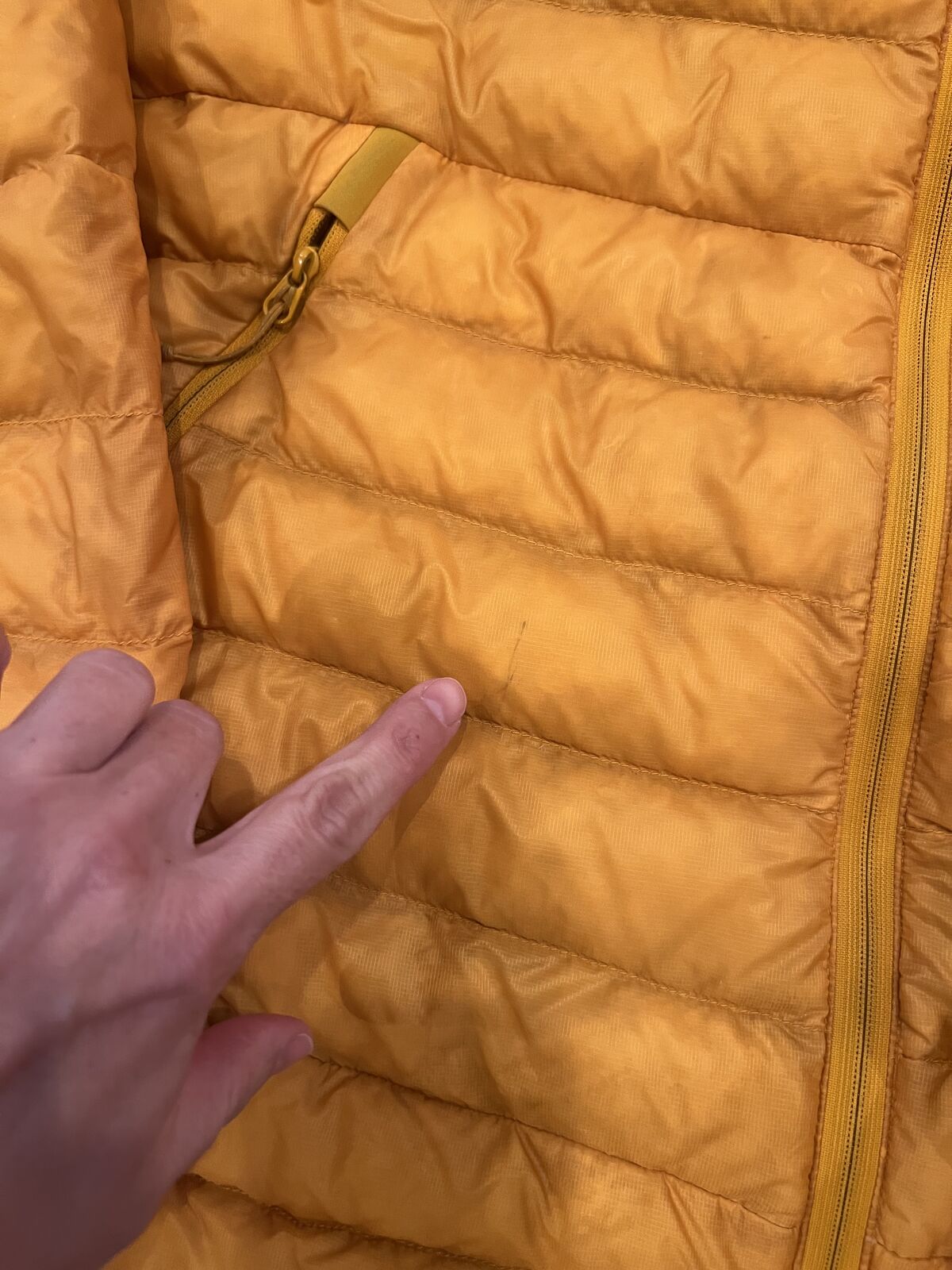 This coat is amazing! I have LOVED it! I recently changed sizes and need a different size. The thing about this coat is the down balls up when you wash it so you need to manually separate it (like if you were to pull apart a cotton ball while it was in a small space). The reason I noticed it was balled up was because the coat would appear darker in areas like the underarms where there is just more compression so the down migrates elsewhere. I contacted them and they paid for me to mail it to them and they “manually redispersed” the down. I don’t really think they did anything. You COULD purchase a down-filling kit online if you’re handy with needle and thread. OR don’t be as picky as me. OR wear it under a ski shell where the contrast in color isn’t noticeable.