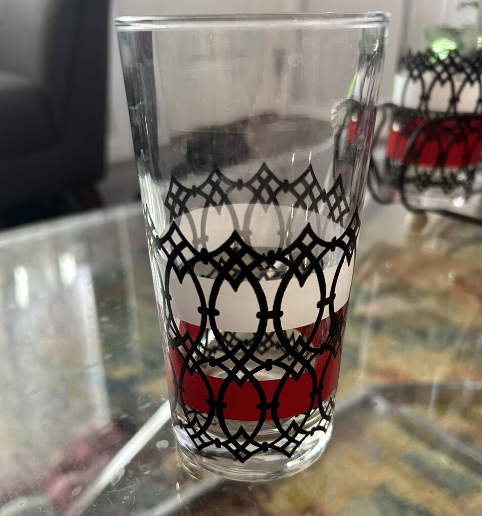 PayPal8 ornately hand painted Libbey glasses with black wire caddy. Stunning mid century modern style, perfect for entertaining. Selling the whole set together.