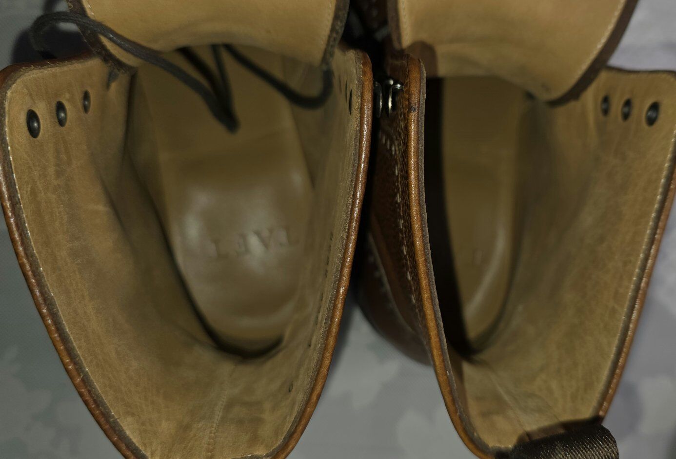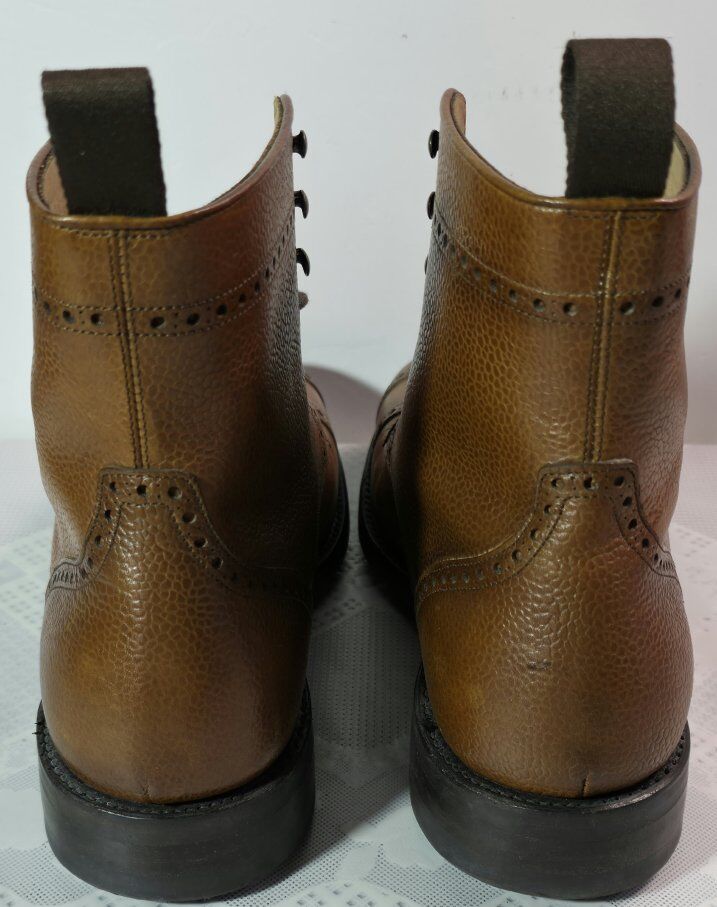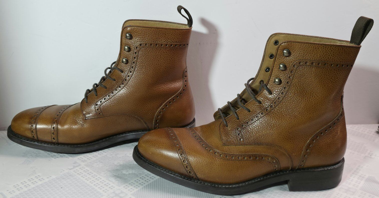 Pre-Owned Men's Taft leather boots with Dainite soles Size 9. This TAFT Gladiator lace-up brogue boots, on cognac colorway. These ankle-height boots feature a distinctive cap toe with intricate brogue perforations and are crafted from a pebbled grain leather. They include a classic lace-up closure with metal eyelets and a rear pull tab for ease of wear. The construction often features a durable sole, such as a Dainite rubber sole, for improved traction. See all photos, text message is better, see my other adds, thank you.