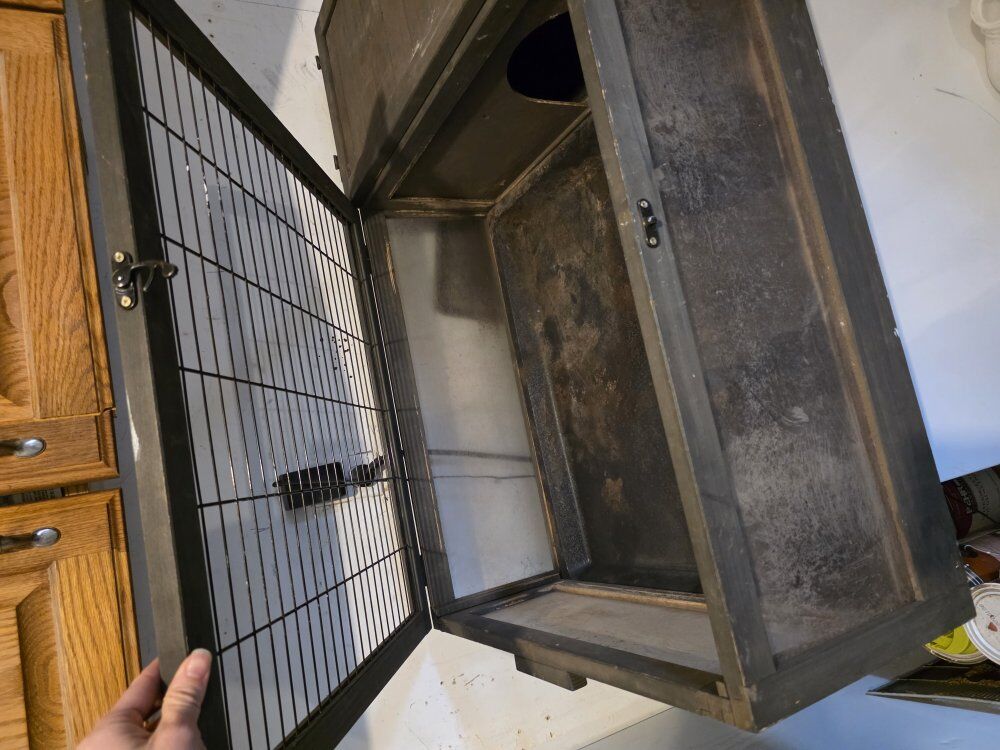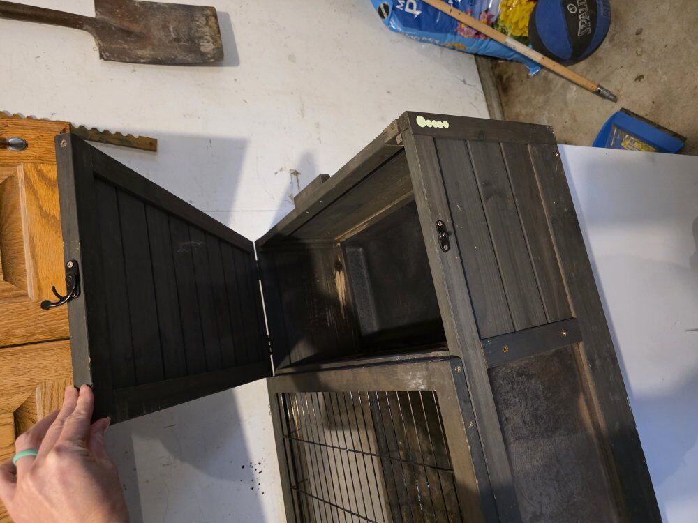 Small/medium tortoise enclosure. Two doors that open up on top and two pull out drawers for easy cleaning