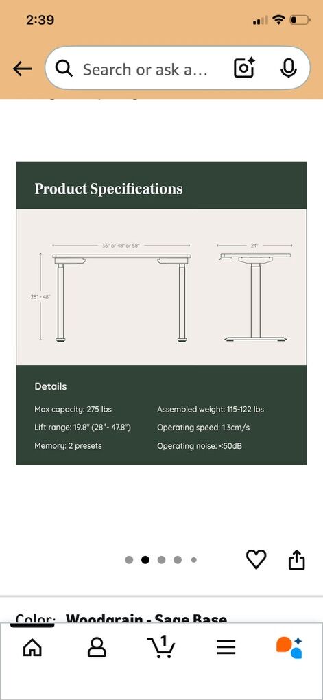 Branch Duo Standing Desk 58 Inches - Adjustable Standing Desk with 20” Range - OLED Control Panel - Frameless Design & Compact Size Suitable for Many Spaces - Woodgrain Top - Sage Base