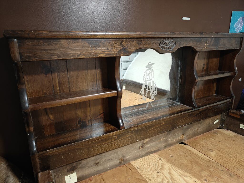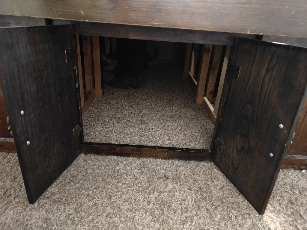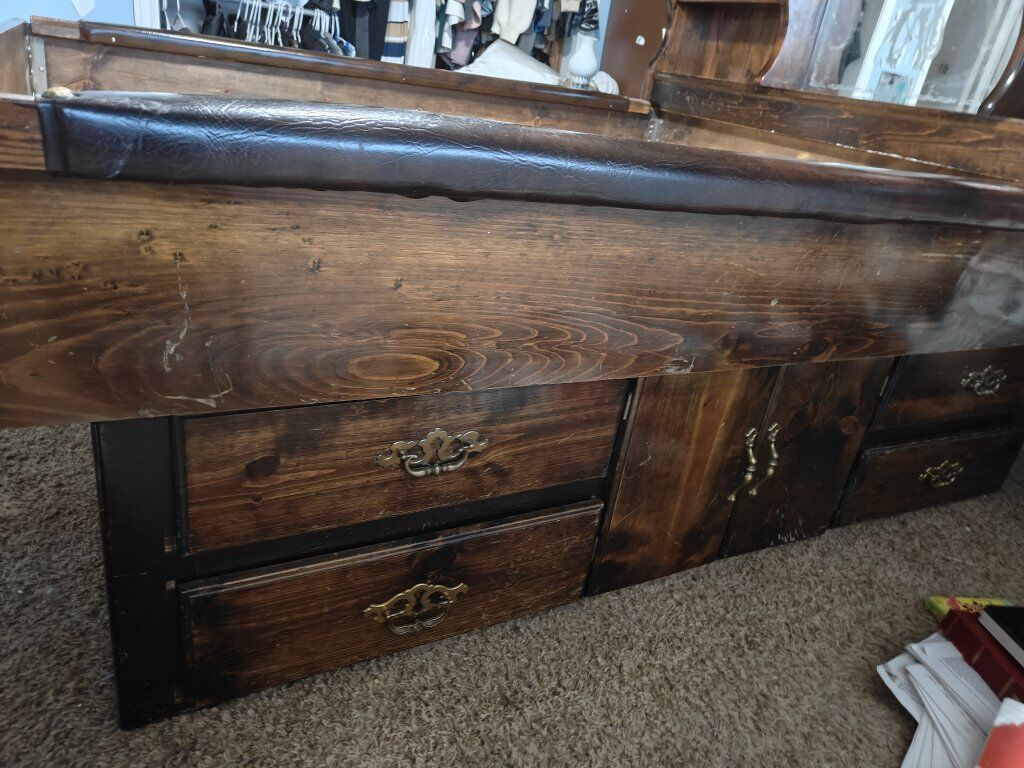 Solid wood bed with lots of storage space. It seems like it was probably a water bed frame at one point but we've had our CA King memory foam bed in it for the last several years and it's worked great. Some of the drawers need a little work but they are still usable. I always planned to refinish it but never got around to it and now we've just gotten new bedroom furniture so it needs to go. I included pictures of measurements but let me know if you have other questions. This is currently disassembled but I took pictures throughout the process so it should be fairly simple to put back together. Accept cash or Venmo.