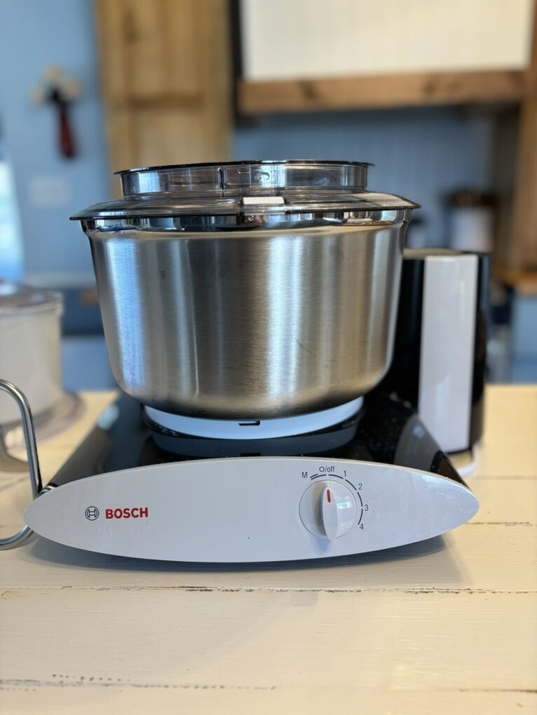 ZelleClean Bosch mixer. Has stainless steel mixing bowl Comes with whisk and dough hook attachment that came with mixer. Also comes with additional stainless dough hook I purchased separately that I used actually for most things like cakes cookies and bread doughs. Also includes flour sifter. Purchased July 2025. Can show receipt upon request. Dial has speeds 1-4 and a momentary setting. Great for baking and cooking. 500w motor. Would be willing to ship for cost of actual shipping Located in Manti, may be able to meet in Utah county