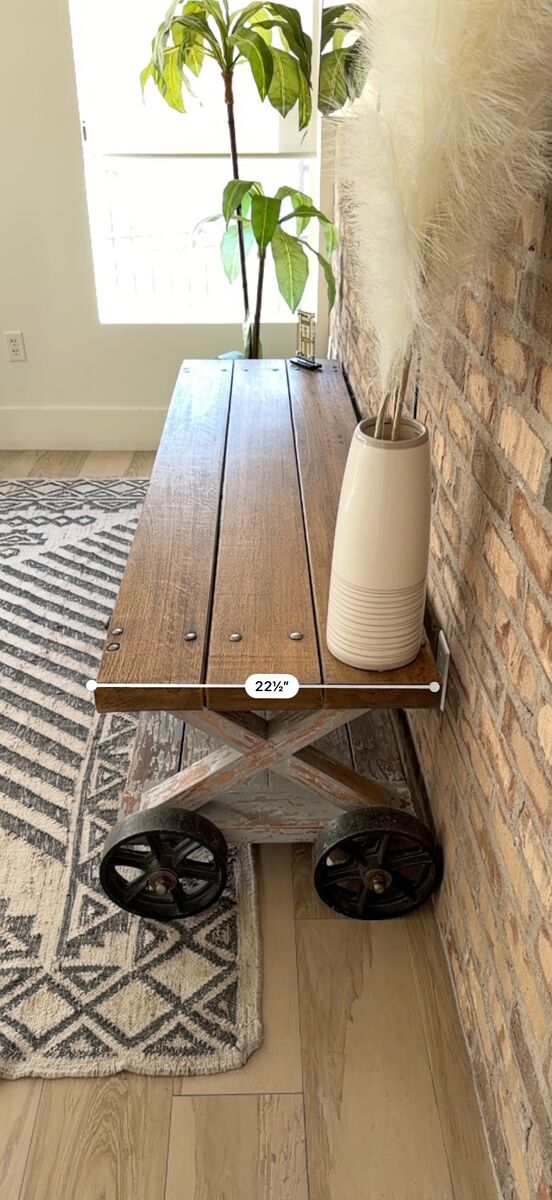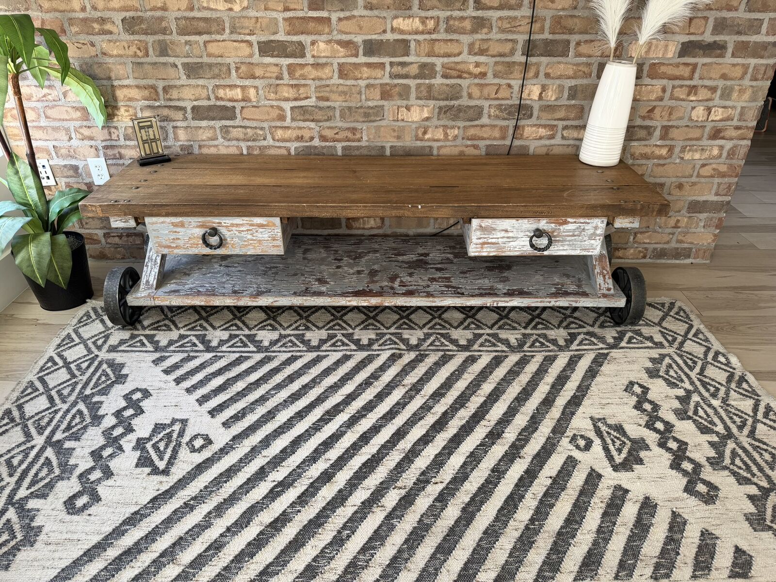 ApplePayIndustrial rolling console / media cabinet with metal wheels. Distressed wood top, functional drawers, and solid build — great for TV setup, office, or storage.