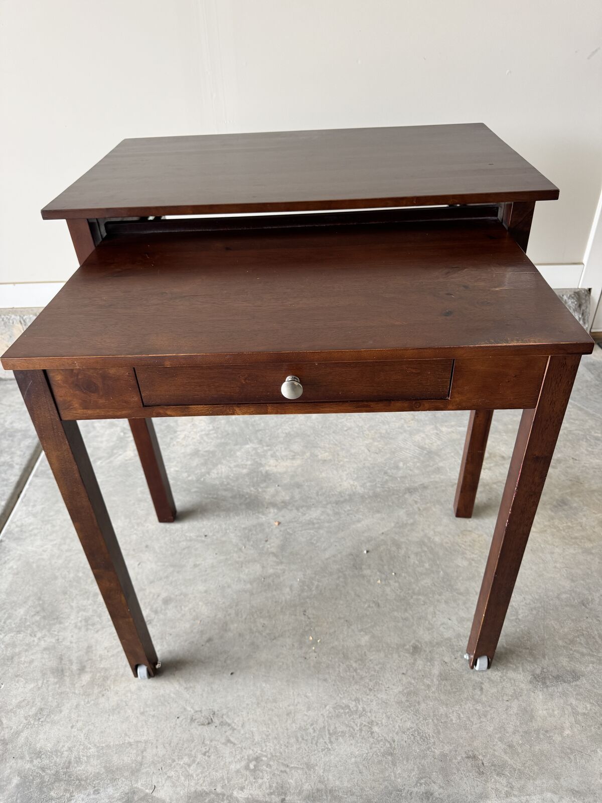 VenmoMahogany colored wood desk with roll out table for writing or keyboard. Decent size drawer for office supplies. COmpanct when roll-out is pushed in. Perfect for a small space. Table is 34" W x 21.5" D x 32" H. Inside of drawer measures 16" D x 14" W.