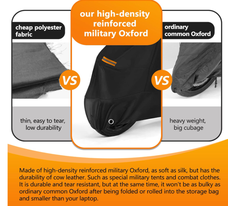WATERPROOF & SPF PROTECTION2-layer silver plated coating inside can withstand up to 3000-3500 water pressure (most competitors' polyester and ordinary oxford only 500-1000). Ultraviolet-proof/SPF (sun protection factor) up to 65+. It protects your motorcycle from rain, wind, snow, birds, leaves, dust, dirt, pollutants, inclement weather, sun, and UV wear, etc.