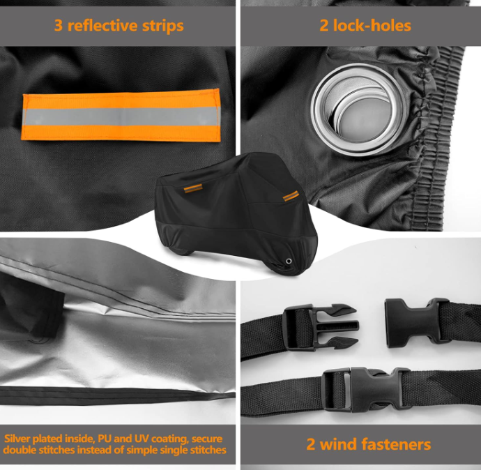TOP GRADE WORKMANSHIPIt uses the more secure double stitches instead of simple single stitches. 3 reflective strips, one on the front and two on the sides. 2 aluminum keyholes and 2 wind fasteners help lock and secure the bike. The double seam elastic hem at the bottom and specially designed buckles keep it safe and secure in windy weather.