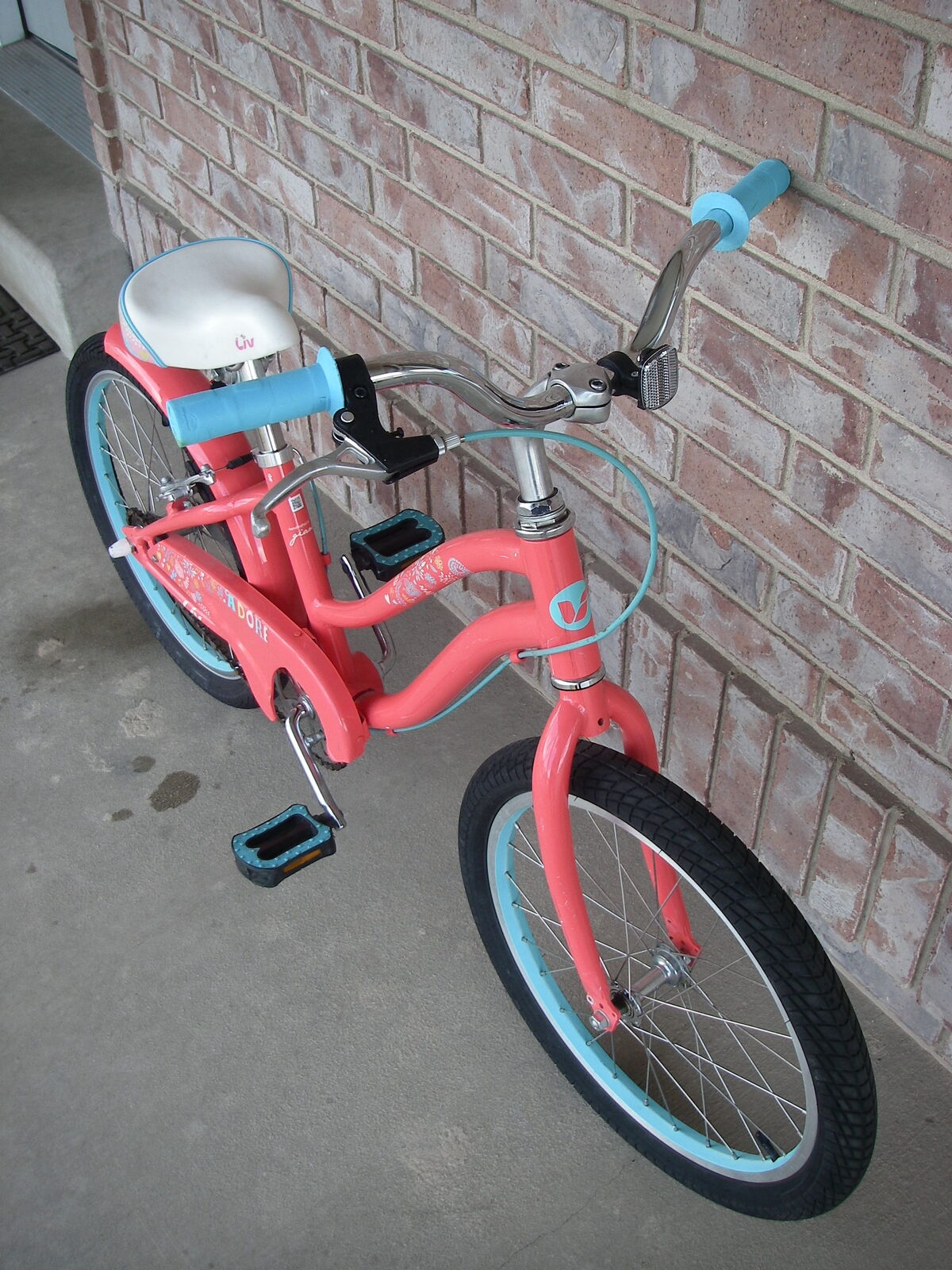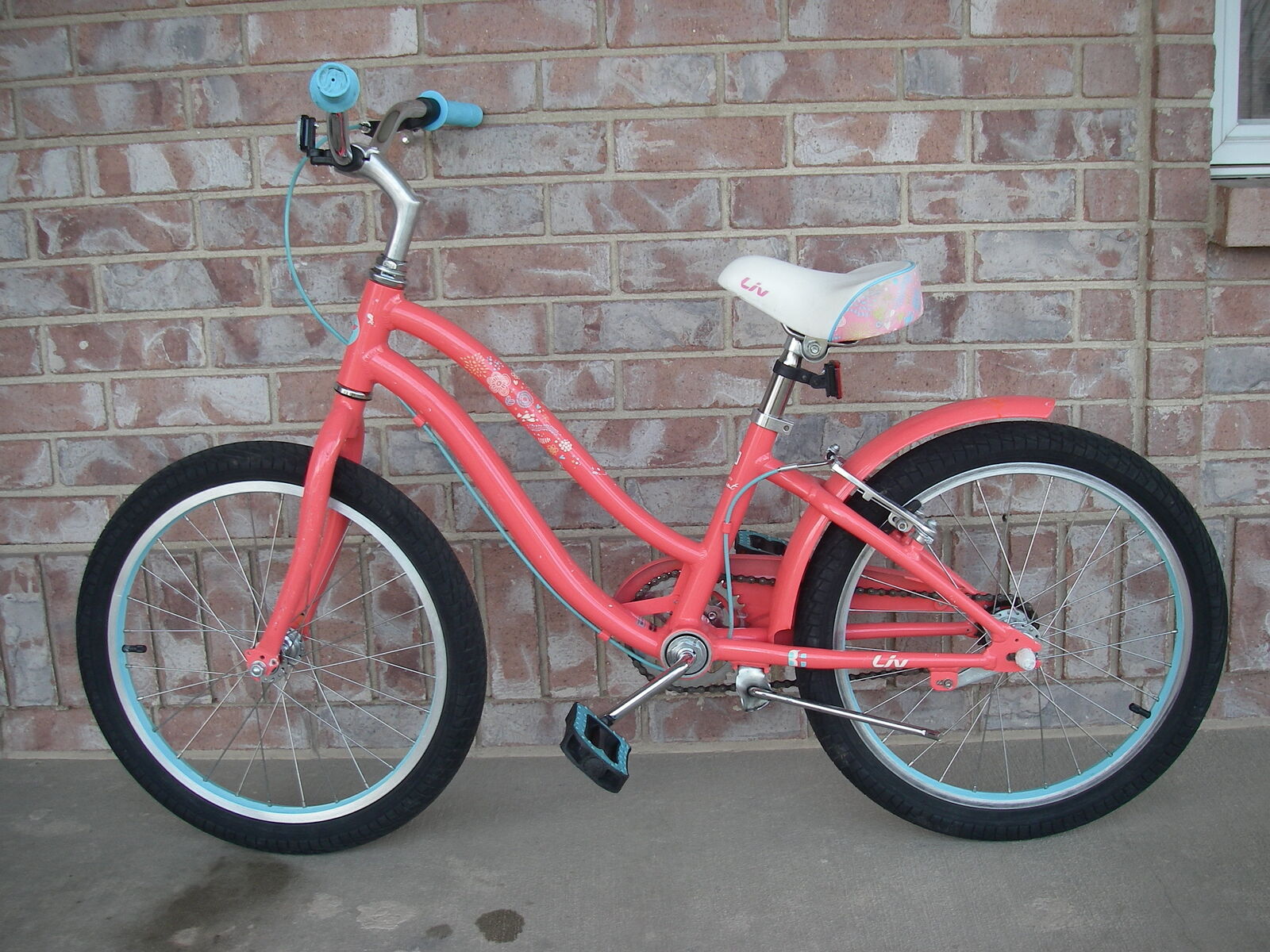 Little Girls 20" (wheel size) LIV ADORE Aluminum BIKE, Coaster Foot Brakes and Rear V-Brakes, Kickstand, Pinkish Orange.