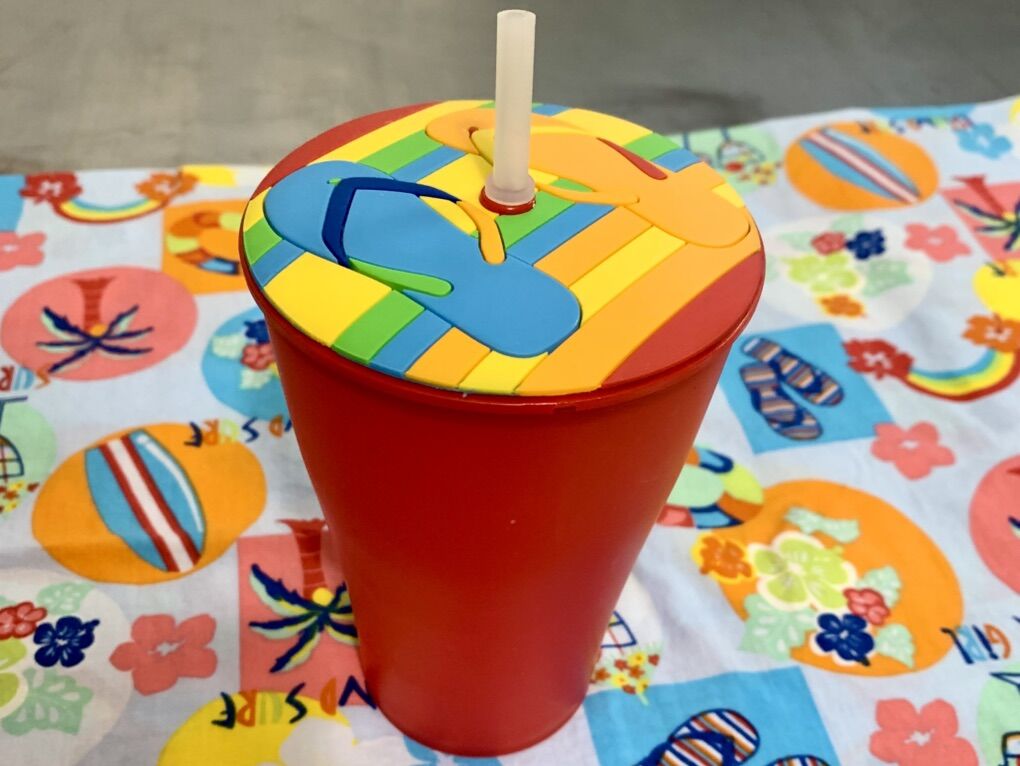 (7) plates (8) cups with lids and straws (1) handmade table cloth 68 X 43