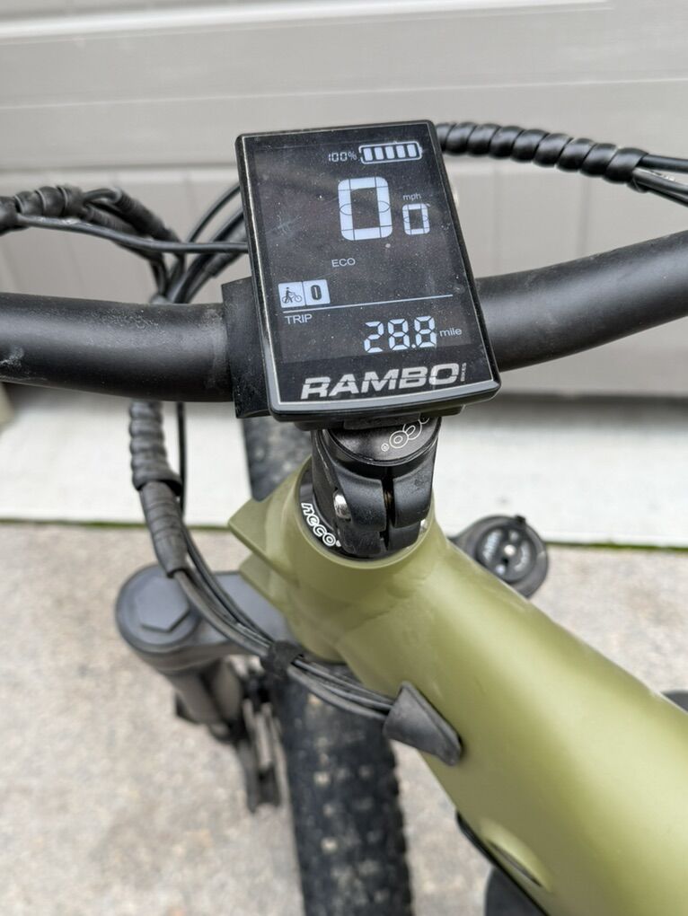 Hardly used Rambo Bushwhacker 2.0 750 KWH e-bike for sale. Only has 28.8 miles. Comes with charger and rear rack. I just don’t use it. I also have a brand new Rambo kayak trailer and a 10’ Aquapod also never used.