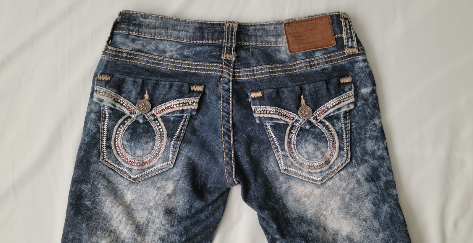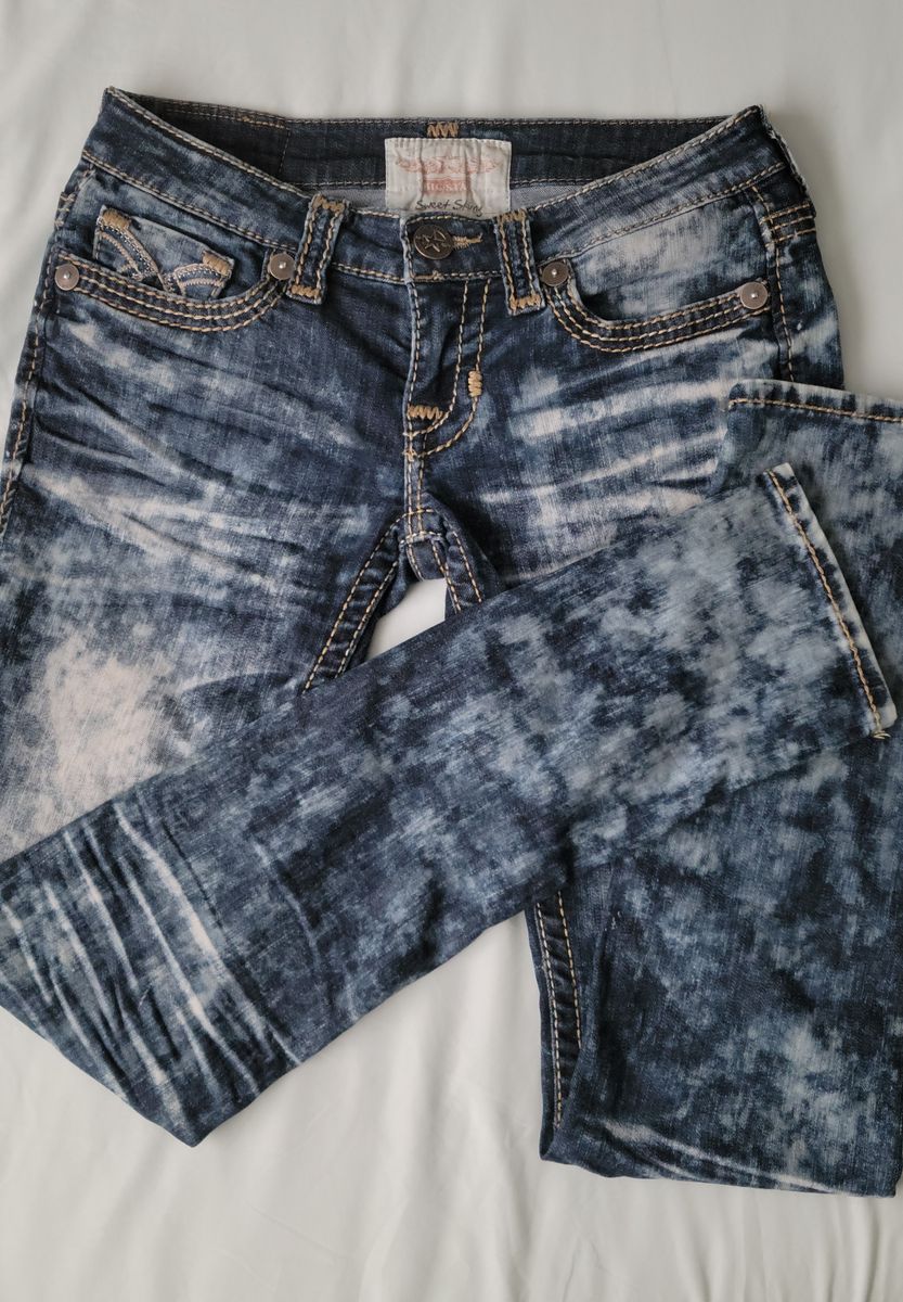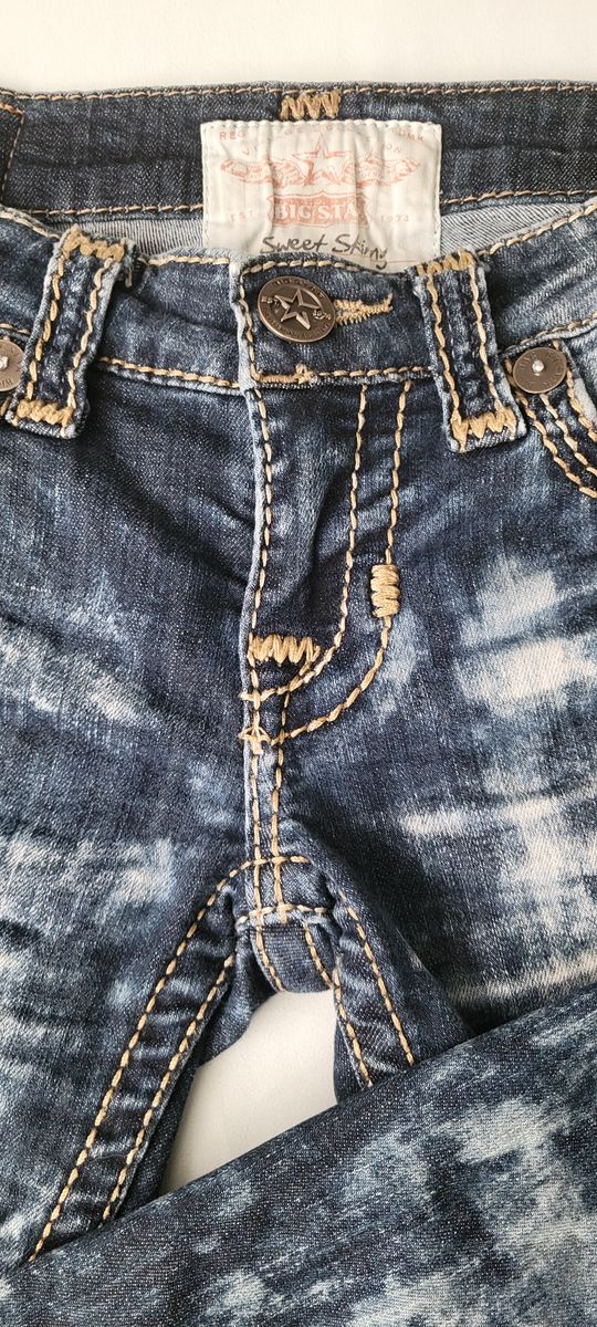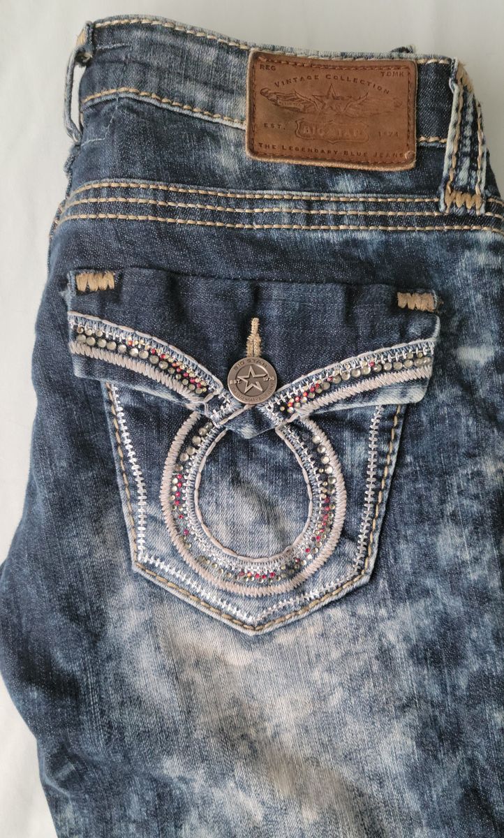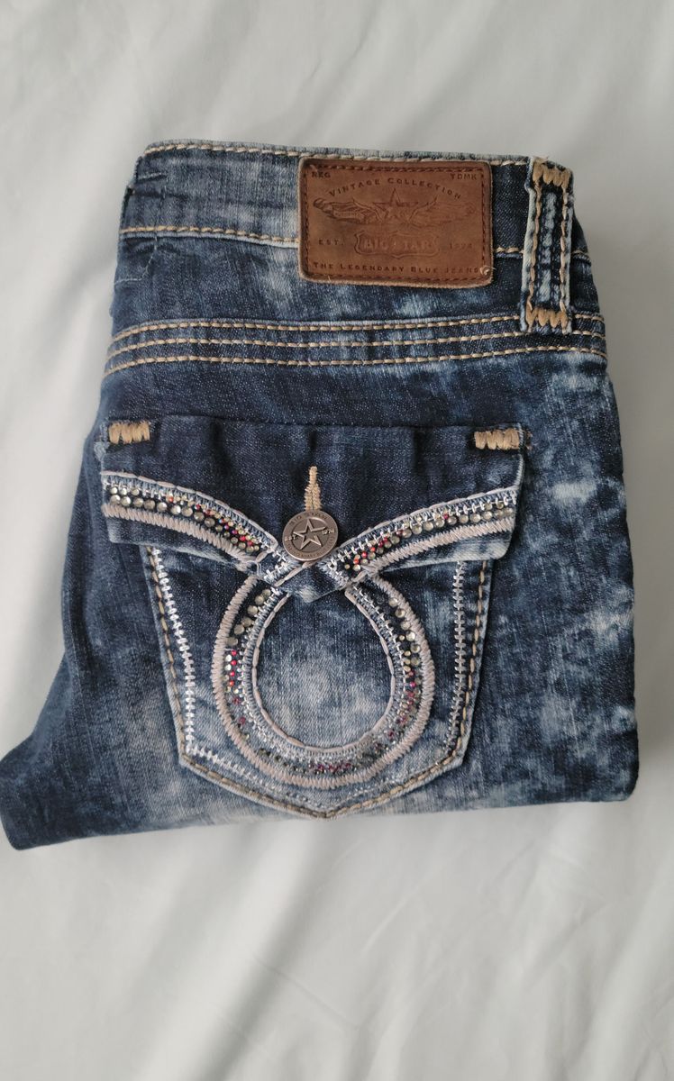 Big Star vintage collection, low-rise sweet skinny stretch Jean with zipfly. Size 26x31, a 26" waist and 31" inseam. They have tiny colored crystals on faux flap back pockets. (Cash Only)