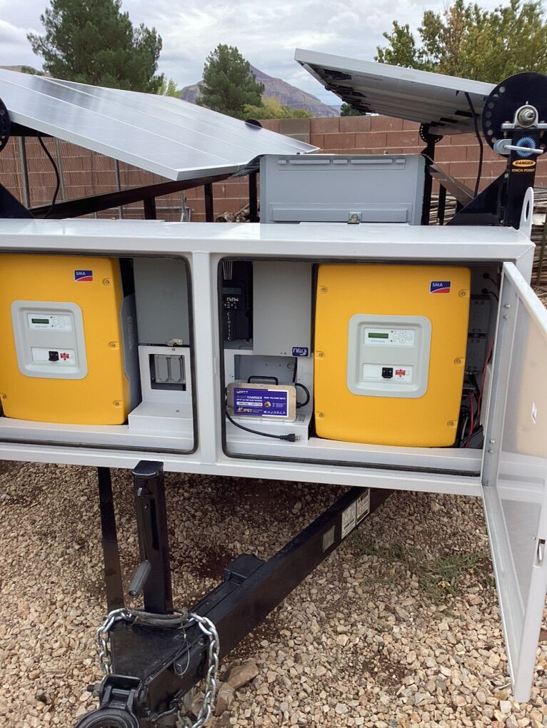 10 - 265 watt solar panels 2 - SMA Sunny Island 6048 inverters 1 - Midnite Solar 250 charge controller 2 - 120/240 volt 50 amp Hubble outlets 6 - 120 volt 20 amp receptacles 1 - 18 amp battery charger 1 - new EG4 14.3 kWh all weather lithium battery Metal waterproof cabinet Rotatable solar arrays Carson 10,000 lb gvwr trailer