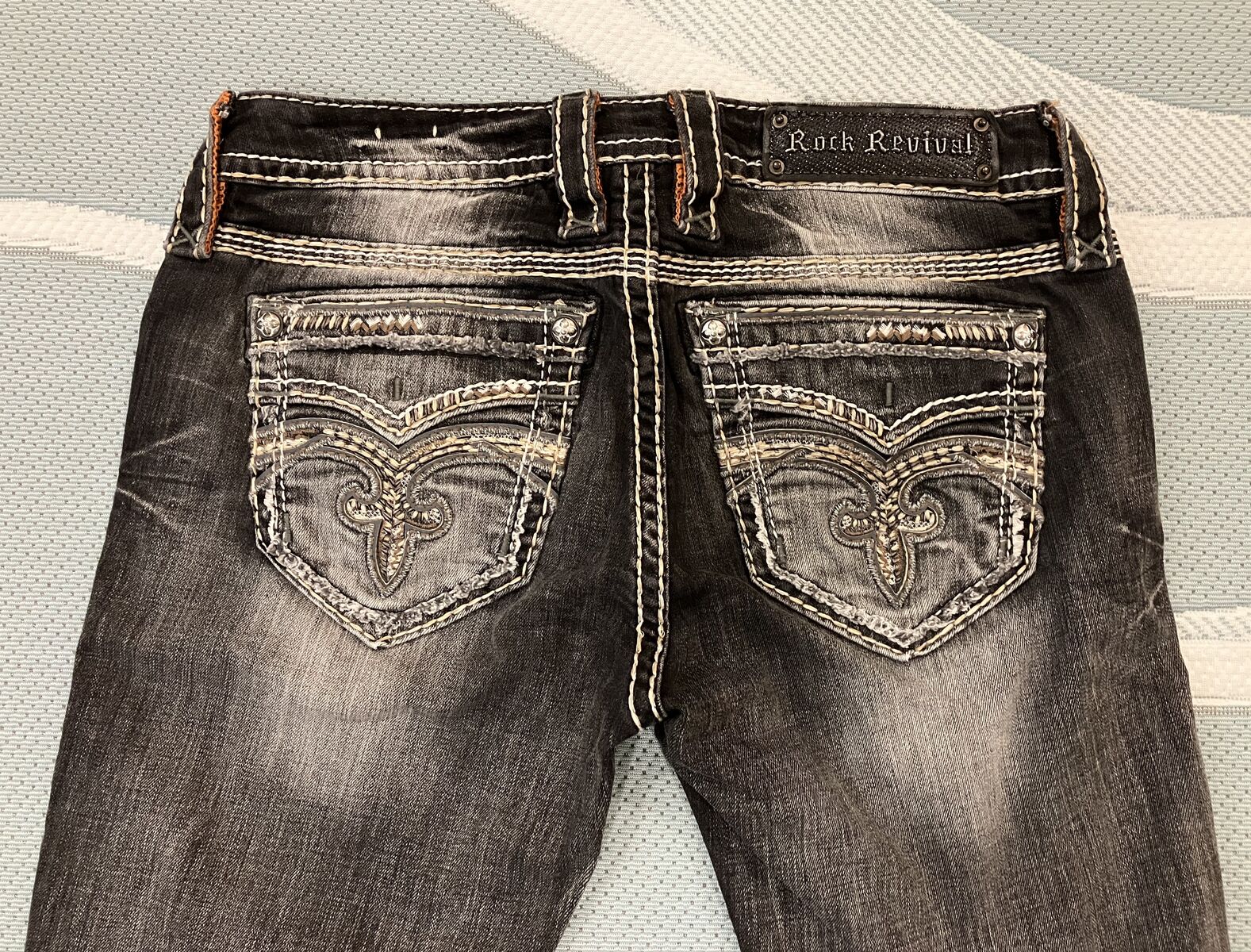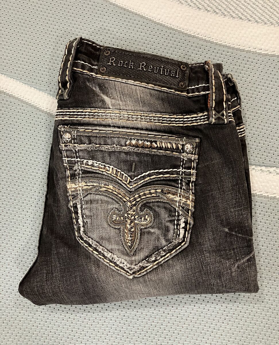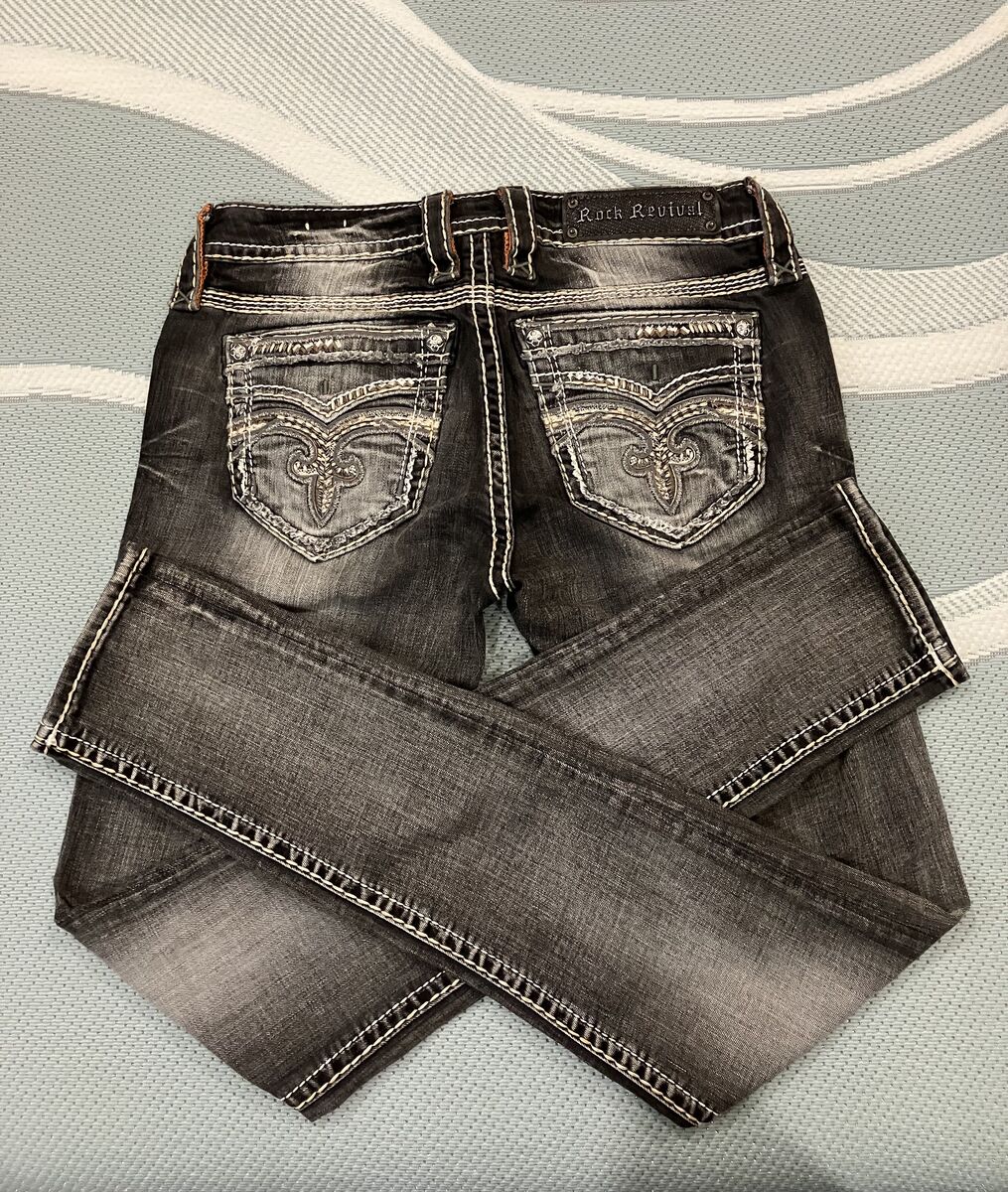 Cute Rock Revival Pilkin lowrise skinny stretch Jeans. Size 26/31L. Lowrise zipfly stretch Jean. Slim through the hip and thight. Embroidred faux back pockets. Hand whiskering and sanding details. (Cash Only)