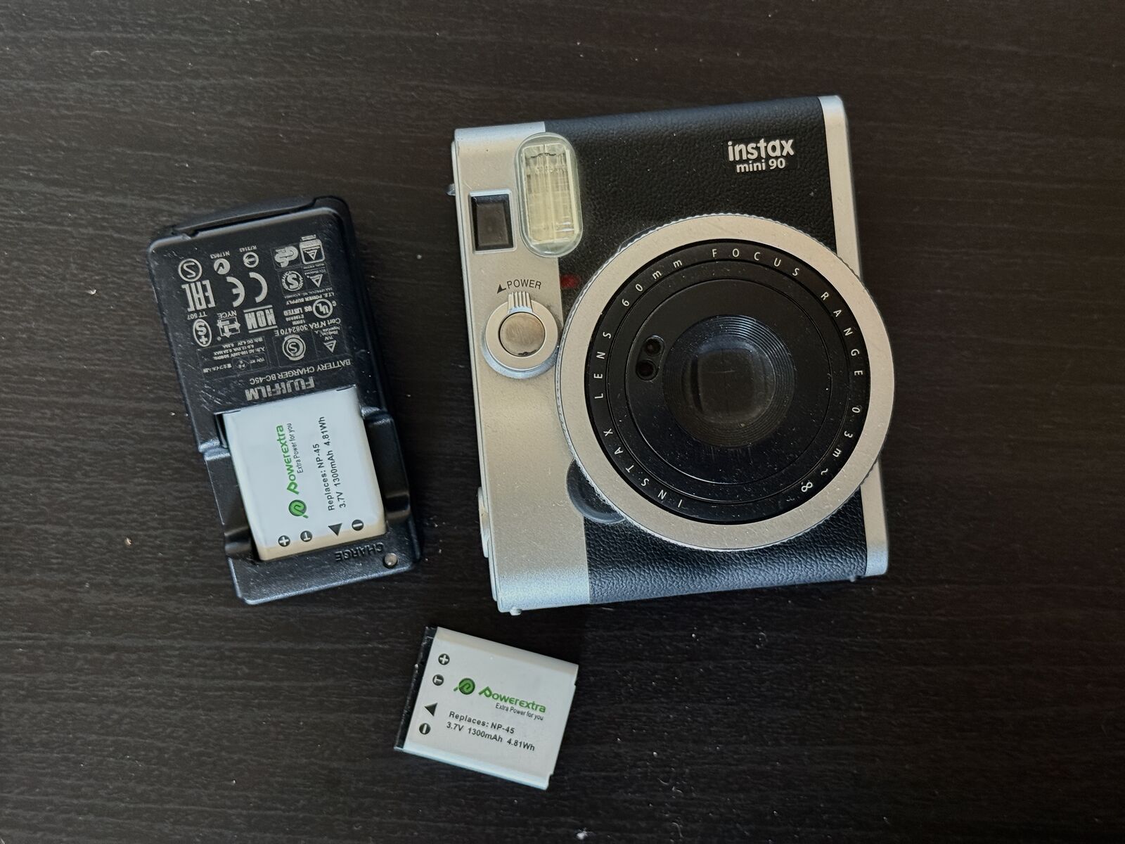ZelleThis Fuji Instax Mini 90 is in good working shape. 2x Powerextra Batteries included with 1 Fuji charger. Both batteries work great. Camera functions, I included a recent image I took on it. The viewfinder has some dust in it but it's still easy to look through and frame.