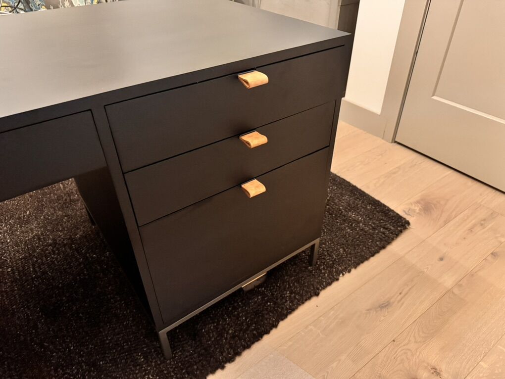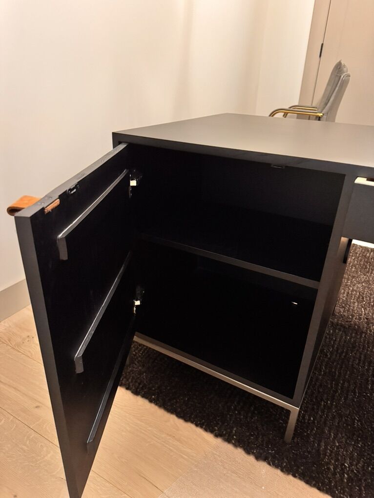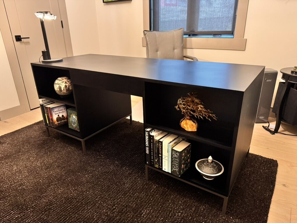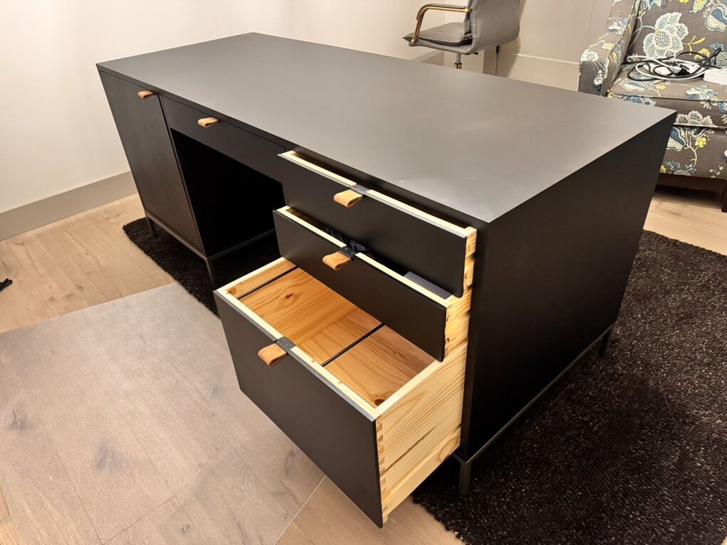 ApplePayModern black desk with storage for books and collectibles. We received this desk and the drawers don’t open all the way so we were sent another one. If you have some wood working skills you can get this for a steal. Paid $1,600.