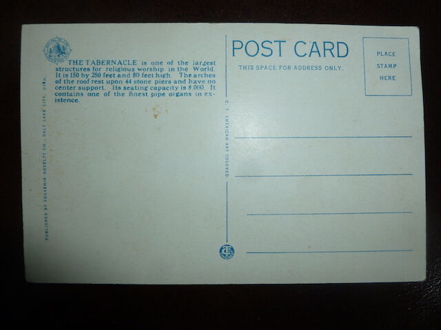 VenmoOwn a collectable piece of Utah history. Thinking these are from around the 1920's. Postage was 1 cent. Both are in excellent condition. The tabernacle postcard gives a lot of detail about it. Like it contains one of the finest pipe organs in existence. I noticed that my photos do not show how vibrant the colors are. This is a fun collectable set. Sold as a set. Price is firm.