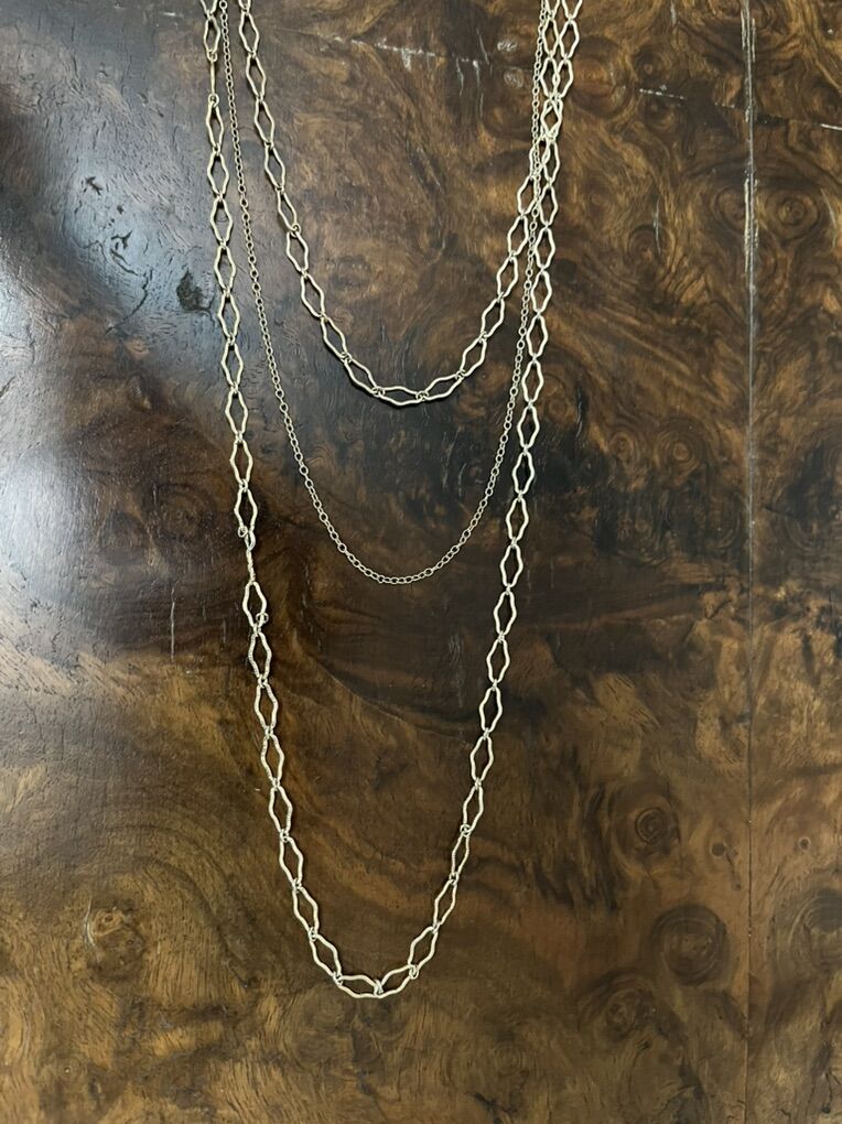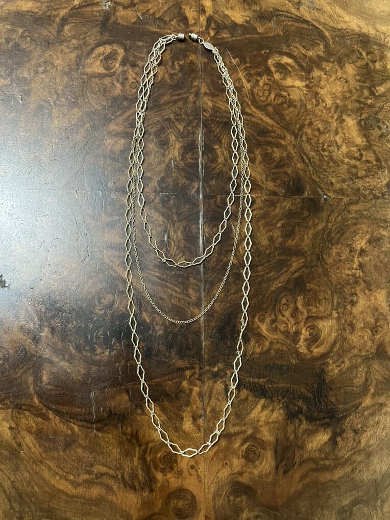 VenmoThis has two matching chains. One is the longest one and the other is the shortest one. The smaller chain is the middle one. This is 19 1/2 inches long. It is marked with the 1928 engraved markers tag. It has the screw on and screw off clasp. The 1928 company started making jewelry in 1968. The business was known for making a vintage look jewelry based on actual antique pieces. I have a two necklaces, a gold or a silver necklace. I have only shown pictures of the silver. The gold is exactly the same. You choose the one you would like. Price is for one. They are simply beautiful pieces. Must see! Price is firm.