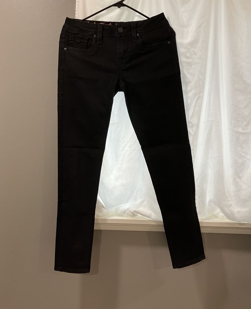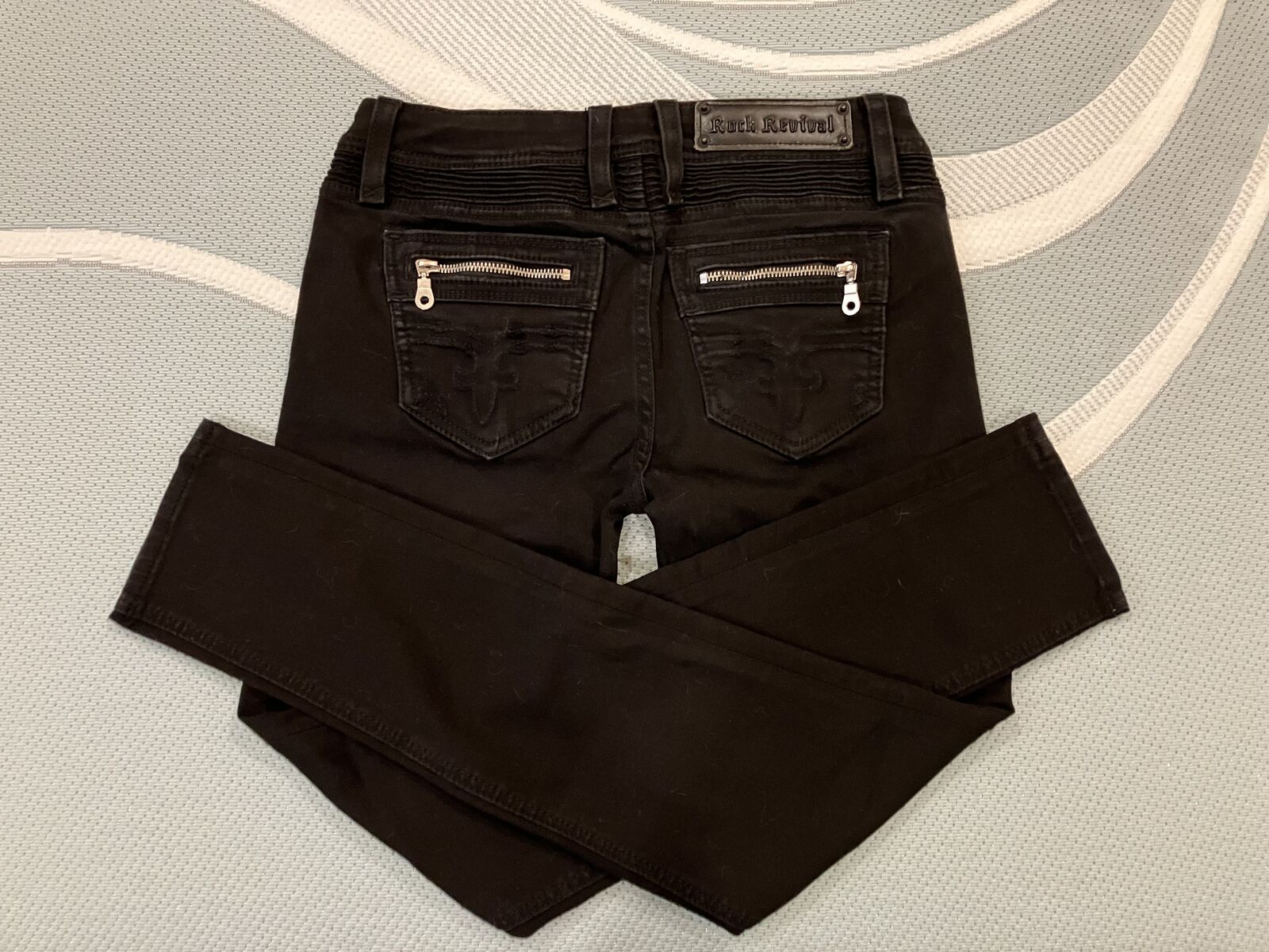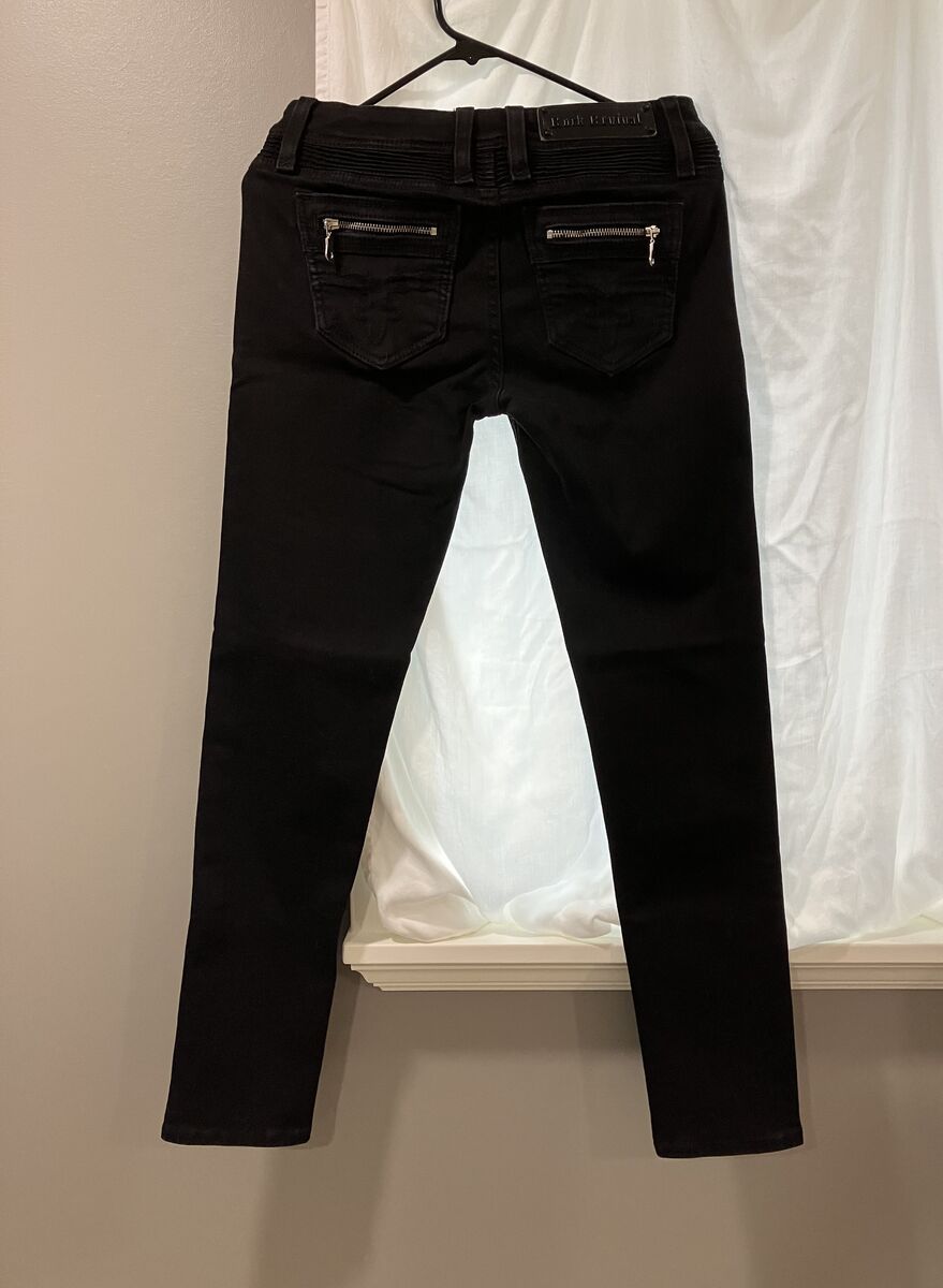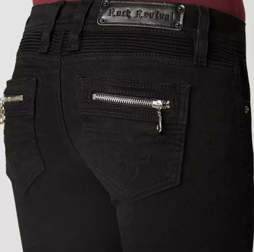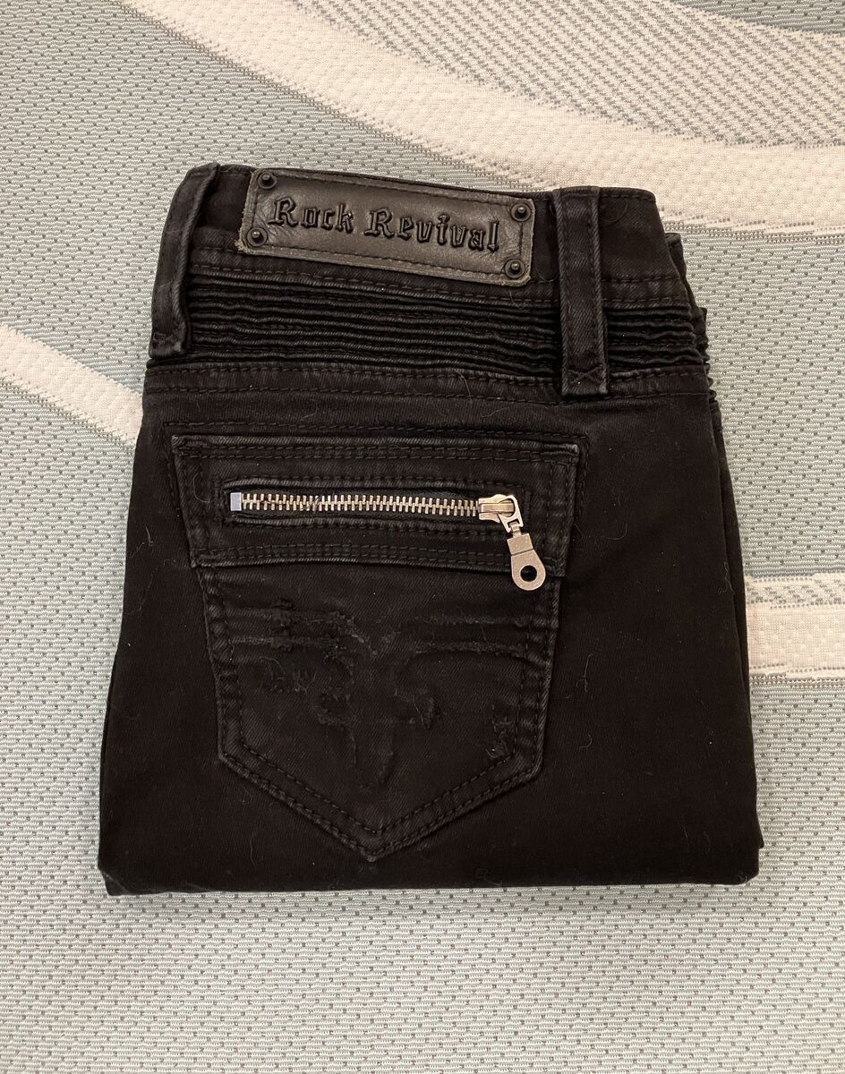 Cute Rock Revival Kamil lowrise skinny Jeans. Size 27/30L, color in black. They are lowrise, skinny stretch, and zipfly. And slim through the hip and thigh. And have zippered back pockets. (Cash Only)
