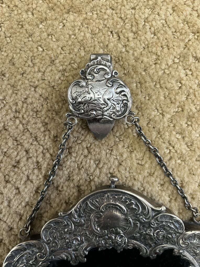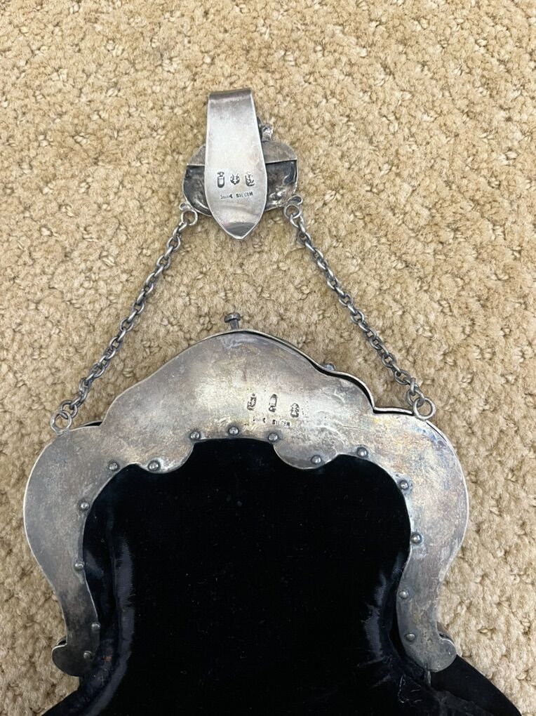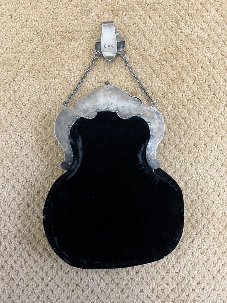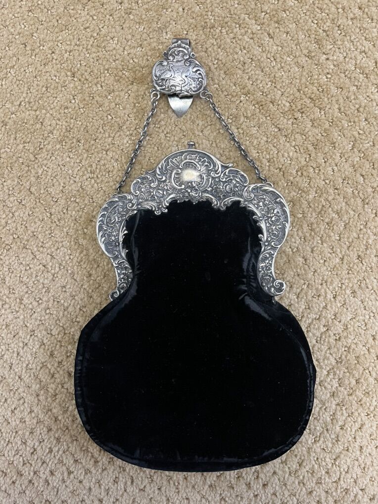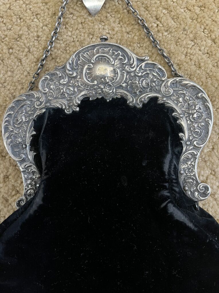 VenmoThis is a stunning purse! It is very old. I took this purse to my jewelers, and they were able to tell me about it. They said this was made in Europe. Maybe Italy. It is marked Sterling Silver on the clip and on the purse frame. It is lined with a suede or a leather on the inside. There is a pair of birds displayed in the silver on the clip. Also, on the clip is a marking 'X111'. There are three different markings on the clip and the frame. These are called Hallmark Stamps. The Hallmark stamps are symbols not letters. The symbols are from jewelers who created them. Jewelers from each county or providence, each have their own special mark. Each piece must be stamped or marked and they are. There appear to be several stamps/marks on this piece. The chain is well made and handmade. Each chain has been soldered thru each link. The detail on the frame is stunning with flowers, leaves, and swirls. The pattern in the silver frame is only on the front side that would show. This purse would have been worn close to the body and clipped to a belt. This would have been a sign of wealth. Especially for a woman to own this and to wear it. This is 9 inches tall x 6 1/2 inches wide. The black velvet does show show a little wear from age or use. Which just adds to the charm of it. The purse is heavy due to the weight of the silver. To open the purse, you push down the small knob on the top of the purse frame. This has a beautiful natural patina on the sterling silver. This is quite a Victorian piece. A must see, one of a kind piece! Price is firm. Serious inquiries only please. No trades.