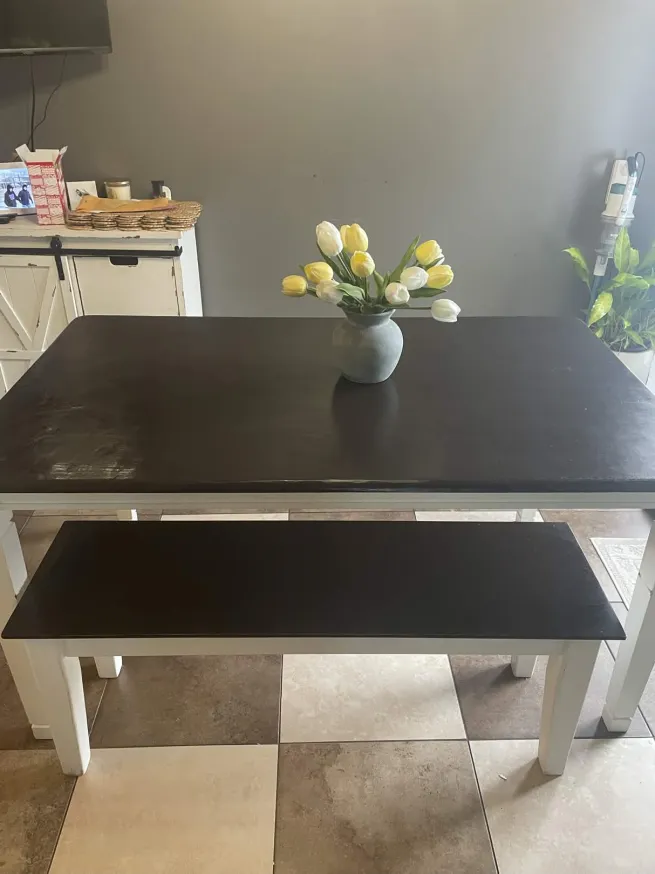 PayPalUp for sale is our sturdy dining table & bench seat. We sanded and repainted the top surface black several years ago; otherwise has normal wear and tear (few minor scratches and such that can be solved with new paint)