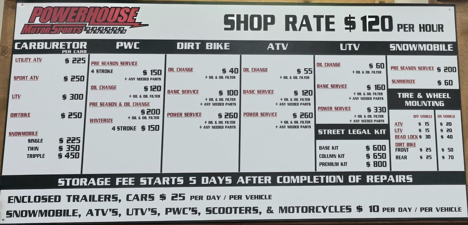 At PowerHouse Motorsports, we specialize in high-quality repair services for your e-moto, ATV, UTV, snowmobiles, dirt bikes, and jet skis. Our expert technicians are dedicated to providing efficient and reliable service at a shop rate of $120 per hour. With a commitment to excellence and a customer-centric approach, we ensure your machines are ready for your next adventure. Trust us to keep you on the trail.