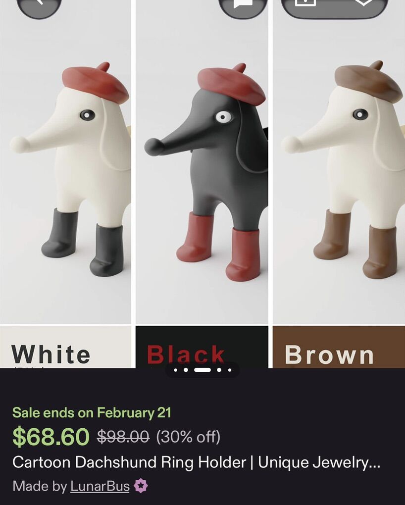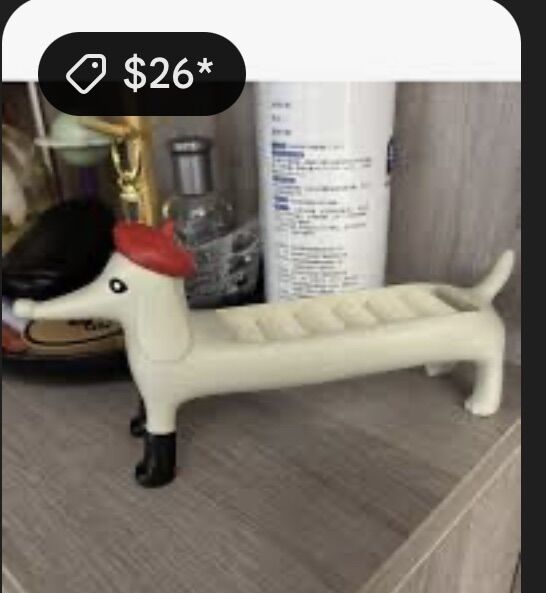 VenmoCartoon Dachshund Ring Holder. Dachshund Ring Holder is a playful and functional jewelry organizer designed to hold rings and small accessories in its ridged back compartment. Product Overview Design: Features a whimsical weiner dog silhouette, often adorned with a red beret and black boots. Function: Specifically used for organizing rings, earrings, and small trinkets on a desk or vanity. Material: Typically crafted from hand-polished resin or ceramic, sometimes featuring soft velvet padding in the ring slots. Dimensions: Approximately 21 cm (8.27 inches) in length