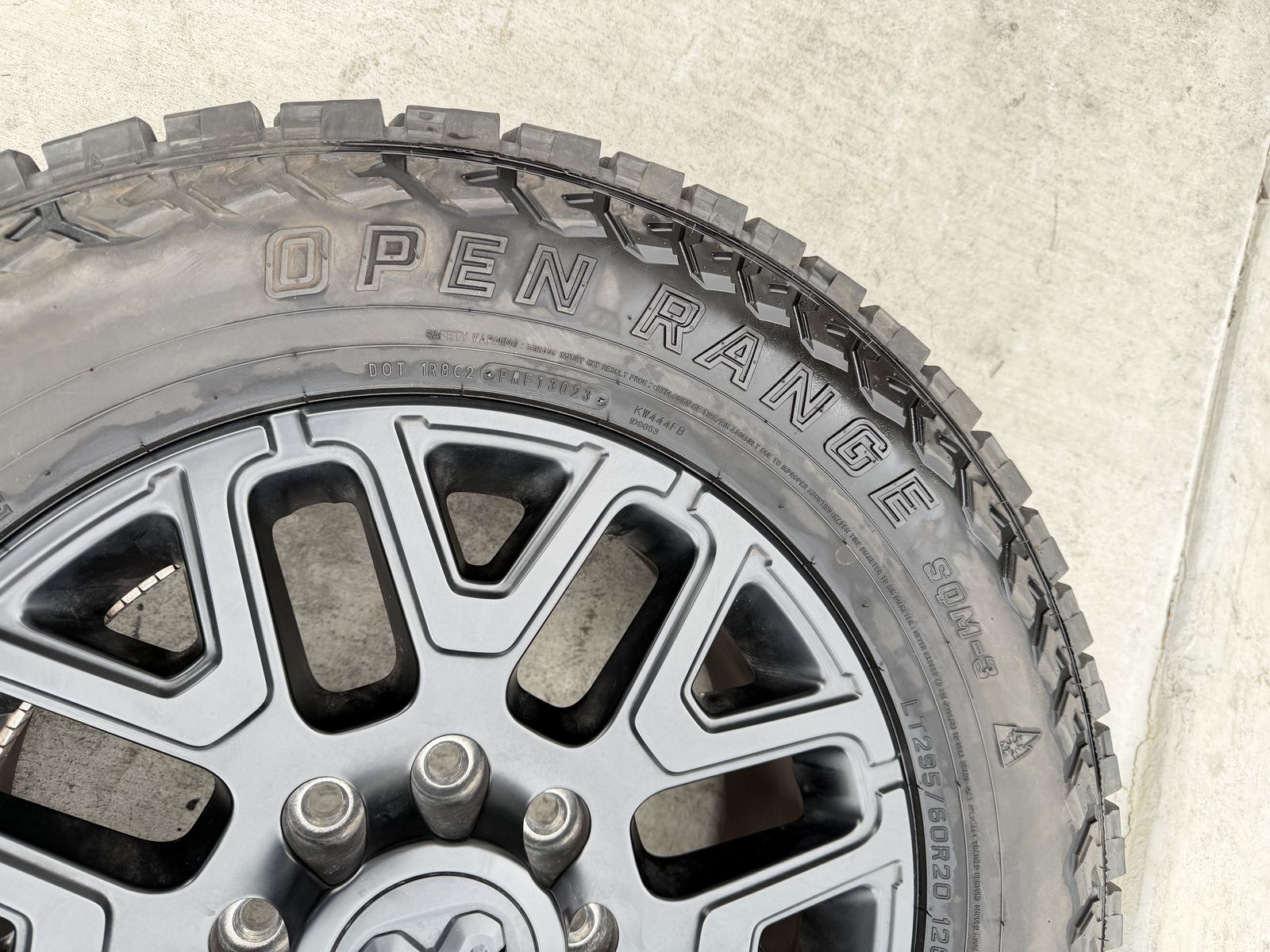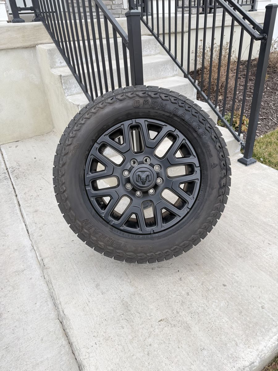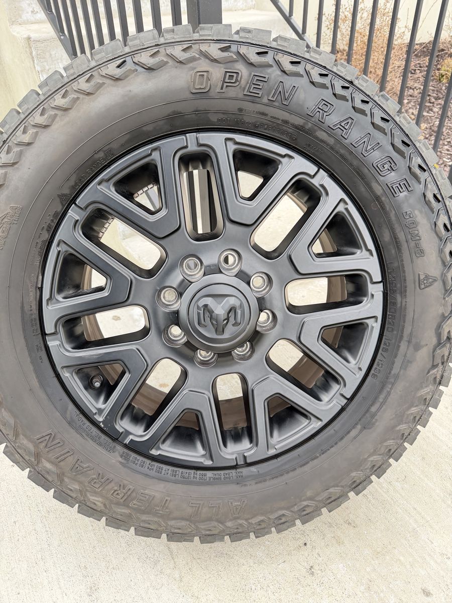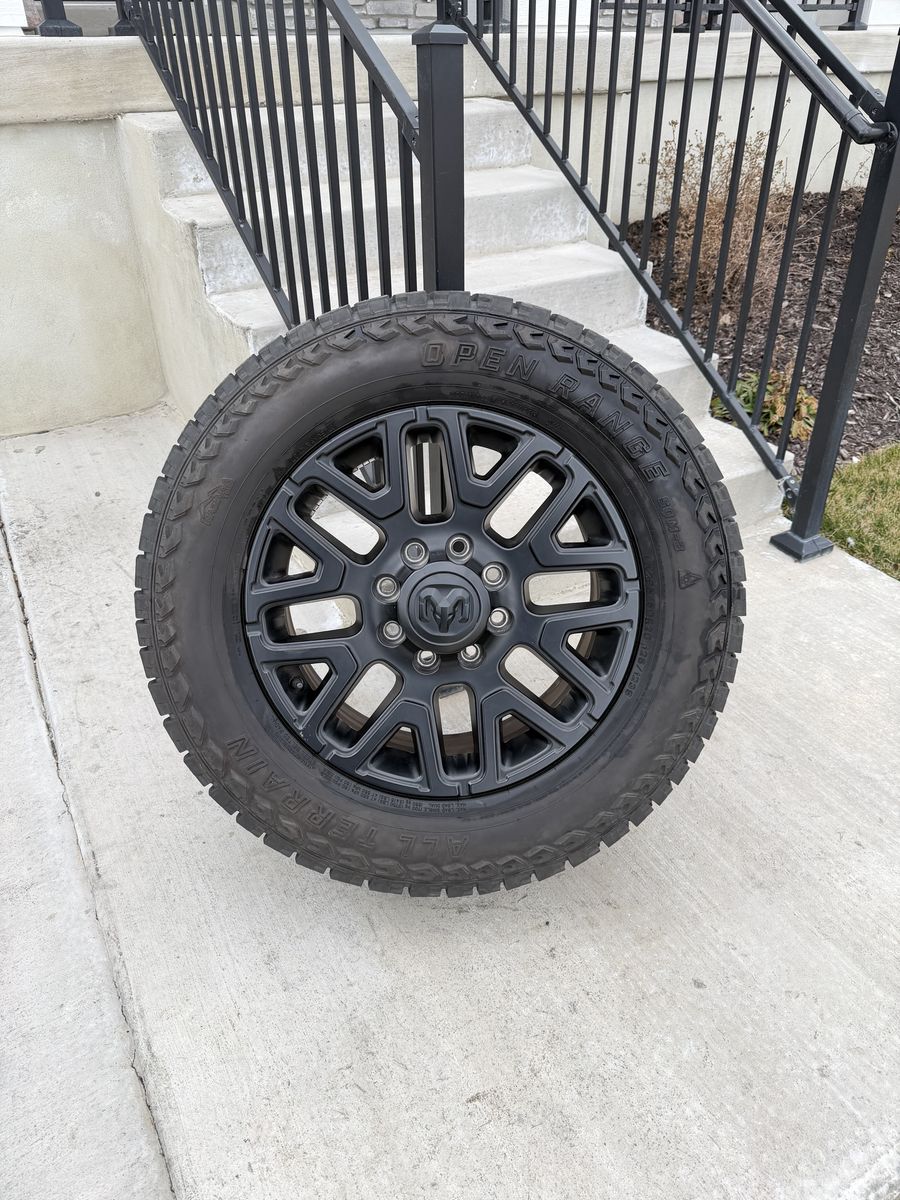 ApplePaySet of 4-Dodge Ram 3500 Limited Rims and Tires 295/60R20 Open Range Load E Like New in great condition only 5000 miles on them,asking $3200 obo Tires are like new in excellent Rims are in great condition 1 rim has a minor scratch on the center cap I can sell the rims or tires separately Comes with lug nuts Bolt pattern 8-6.5 Text anytime 385-402-2292