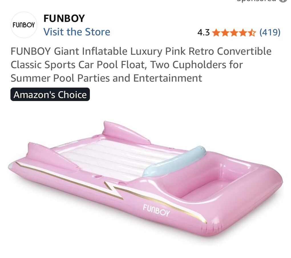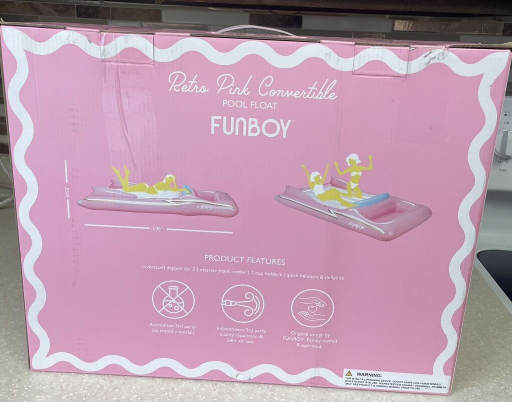 VenmoFunboy Retro Pink Convertible pool float. • It is an oversized float, approximately the size of a queen mattress, designed for two people. • The float includes a built-in storage area for drinks or other accessories. • It is made from PVC material. • Dimensions are 105L × 59W × 13H.