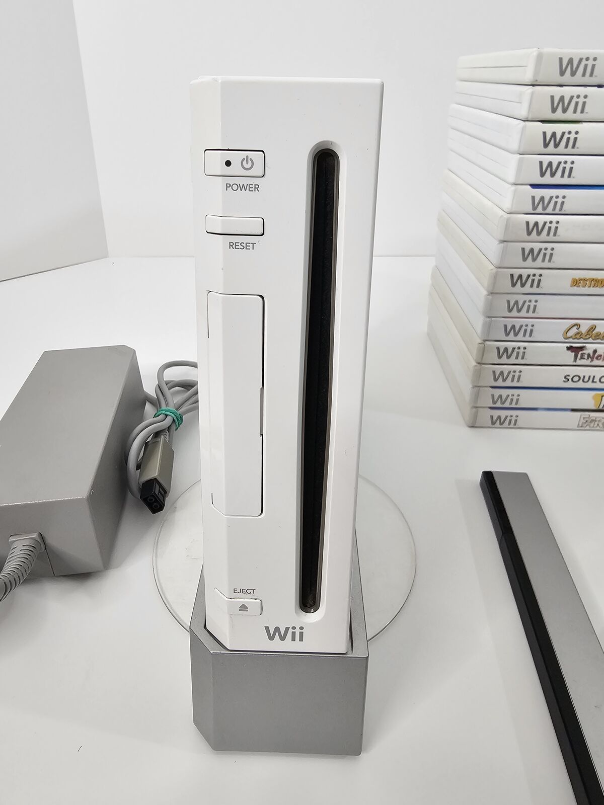 Console: Original White Nintendo Wii (Model RVL-001) with Vertical Stand.