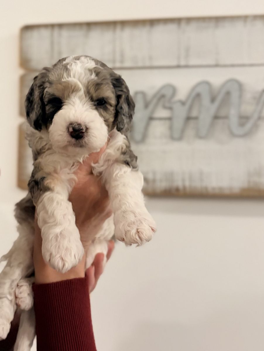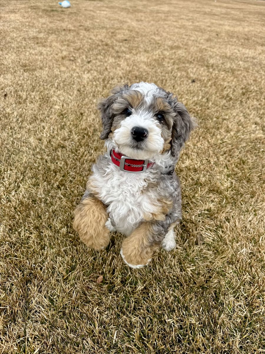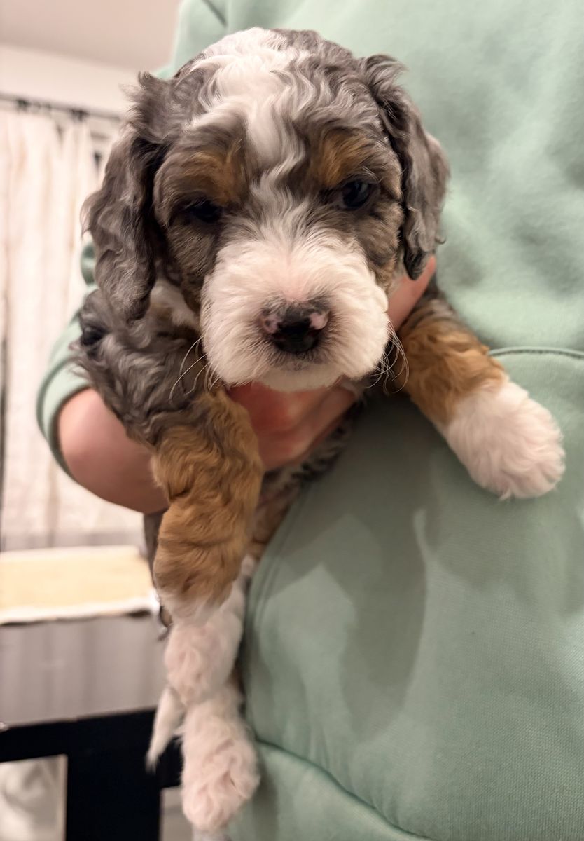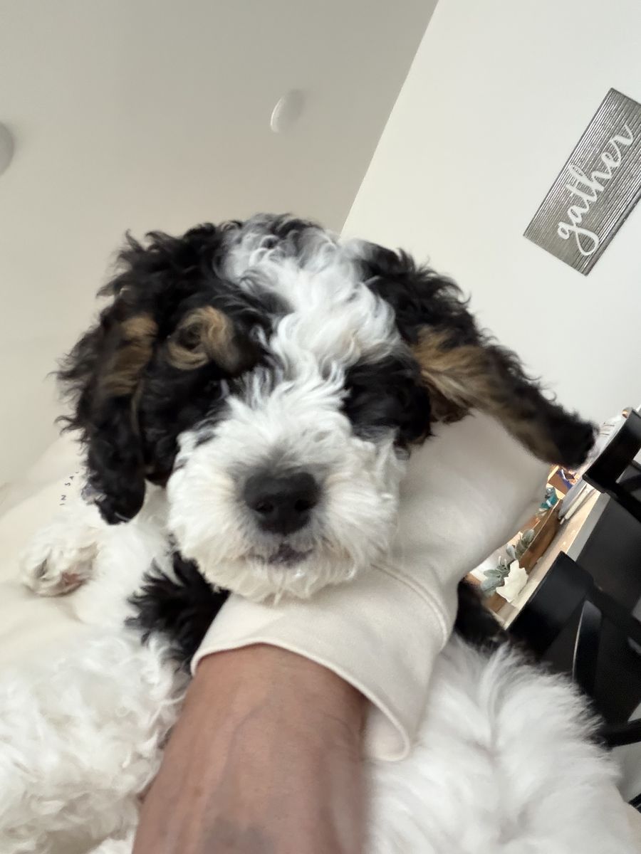 Papa Our 20 lb micro multigenerational Bernedoodle stud with the sweetest temperament and the fluffiest, non-shedding coat. He is genetically health tested, clear of disease, and carries the non-shedding gene we intentionally select for in our lines.