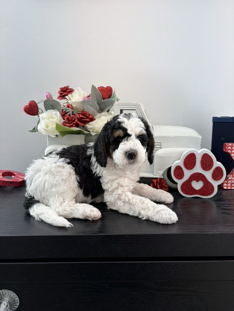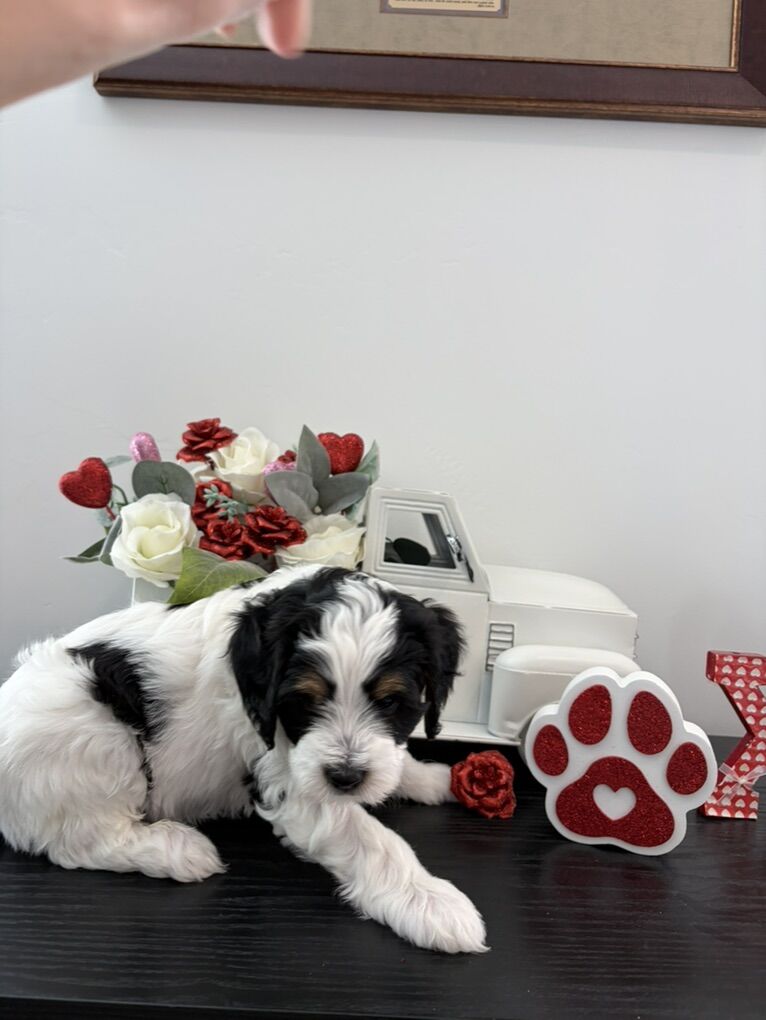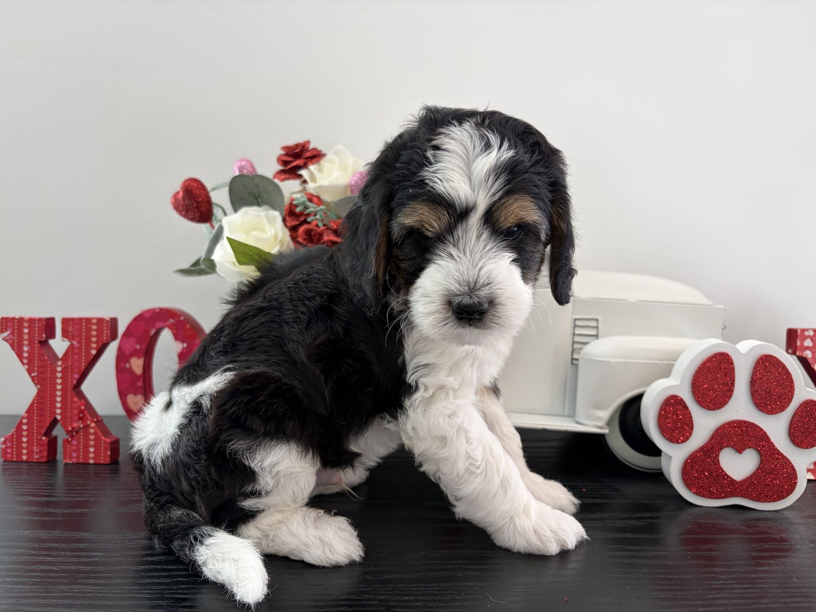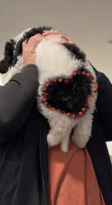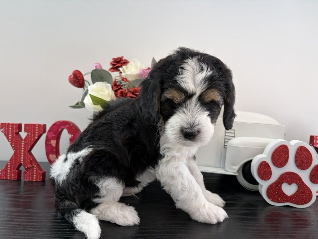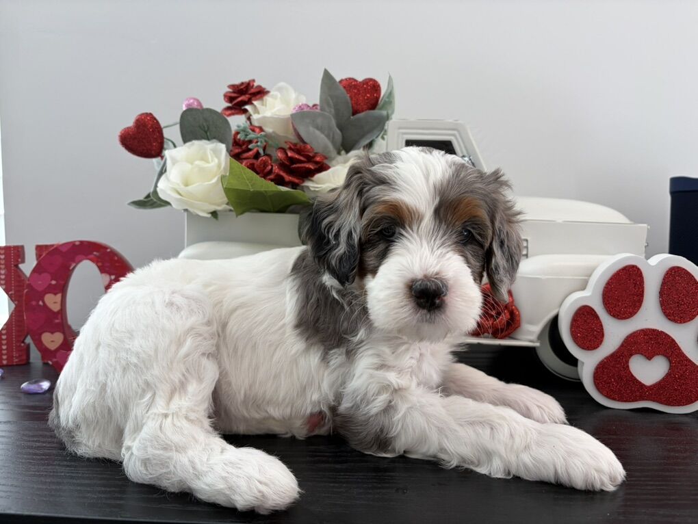 Papa Our 20 lb micro multigenerational Bernedoodle stud with the sweetest temperament and the fluffiest, non-shedding coat. He is genetically health tested, clear of disease, and carries the non-shedding gene we intentionally select for in our lines.
