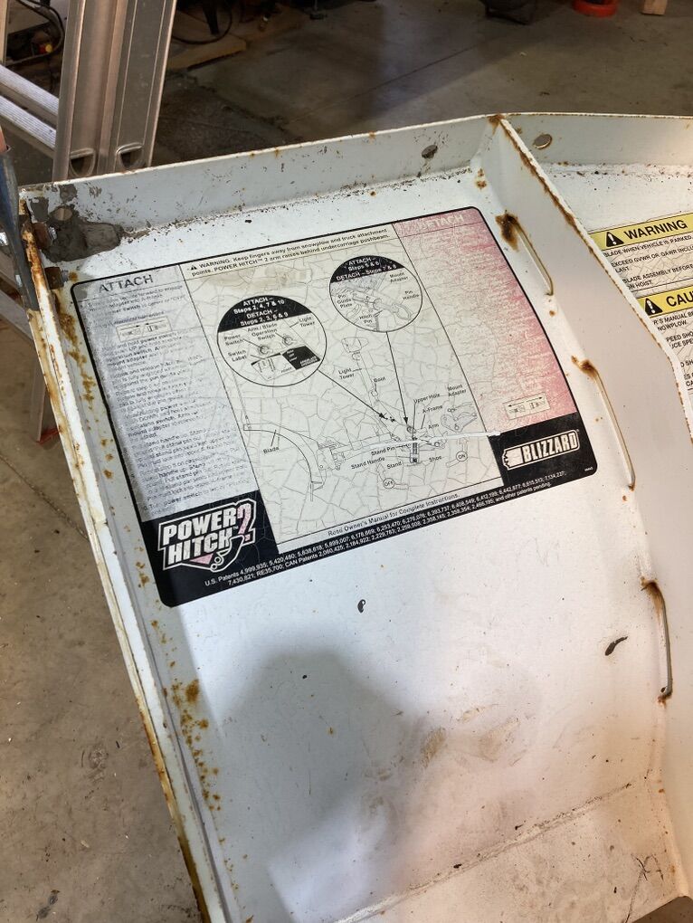 Blizzard heavy duty 8’ plow plow. Mold board, A-frame, attach points, hydraulic cylinders and pump are in decent shape. One head light is broken. I just got this so don’t know the history but it is too big for my 1/2 ton truck. You’ll need a mounting kit or truck wiring harness (both are unique to the truck). The in-cab controller is missing. The wear bar has some life left.