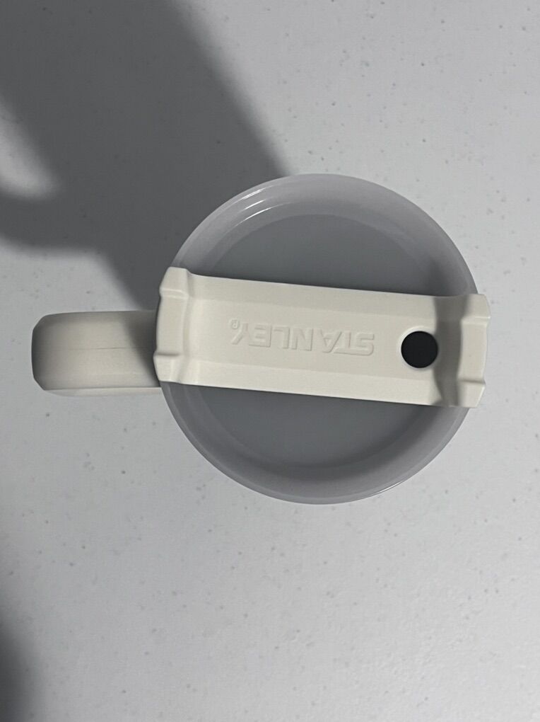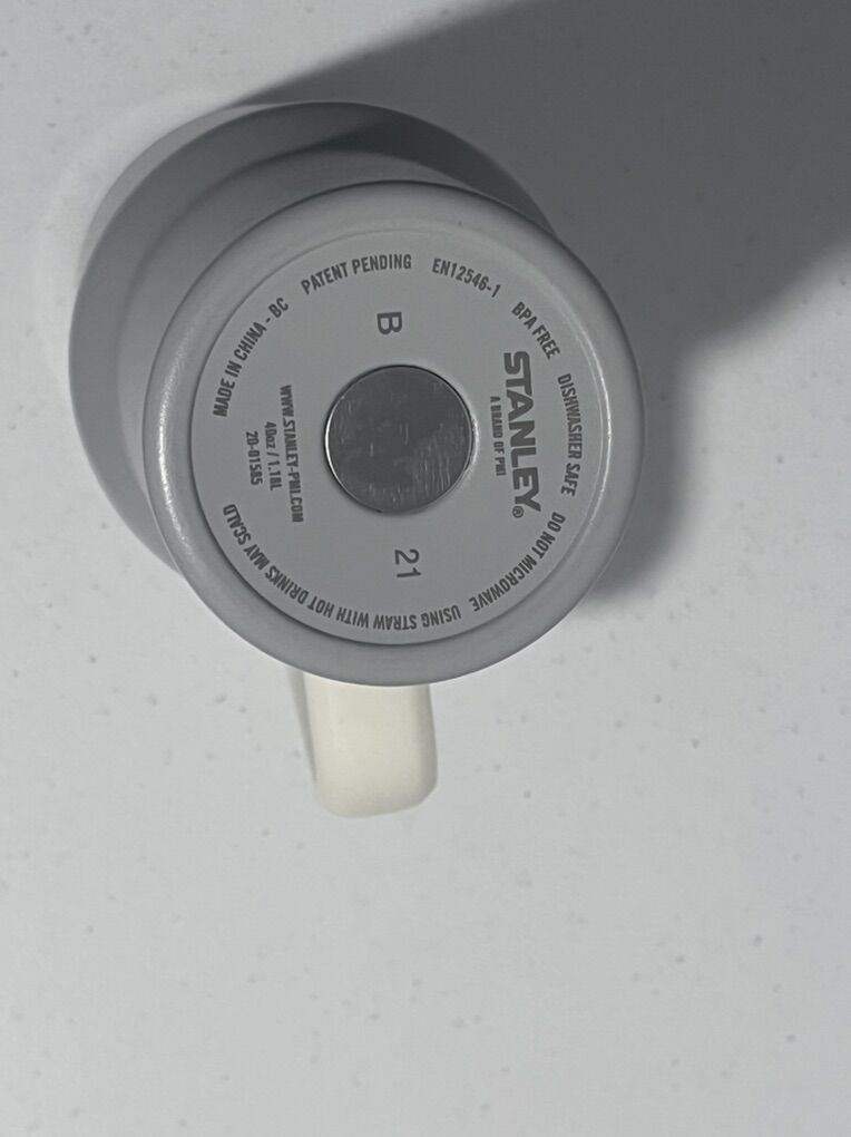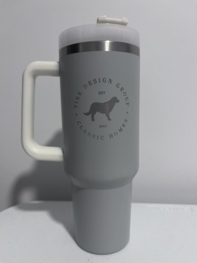 VenmoLight gray water bottle with handle Has a company logo engraven on the mug, otherwise it’s your typical Stanley mug