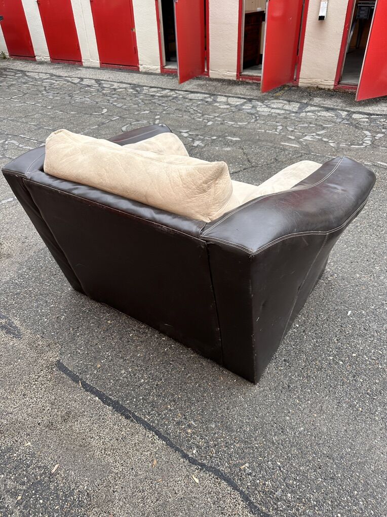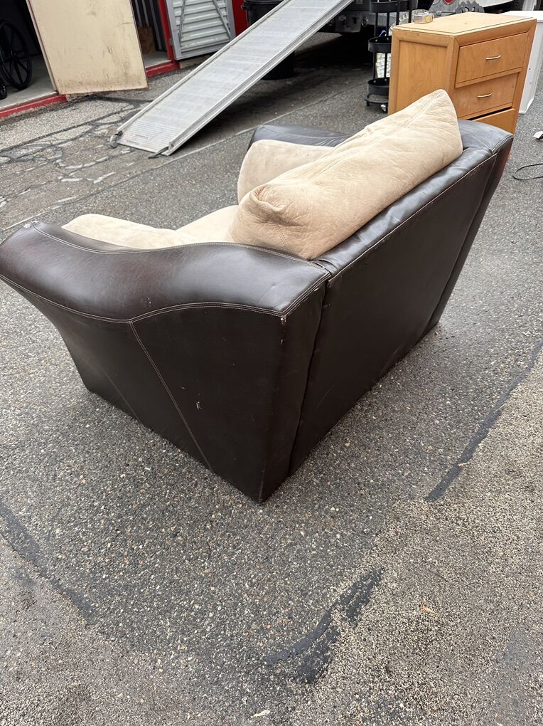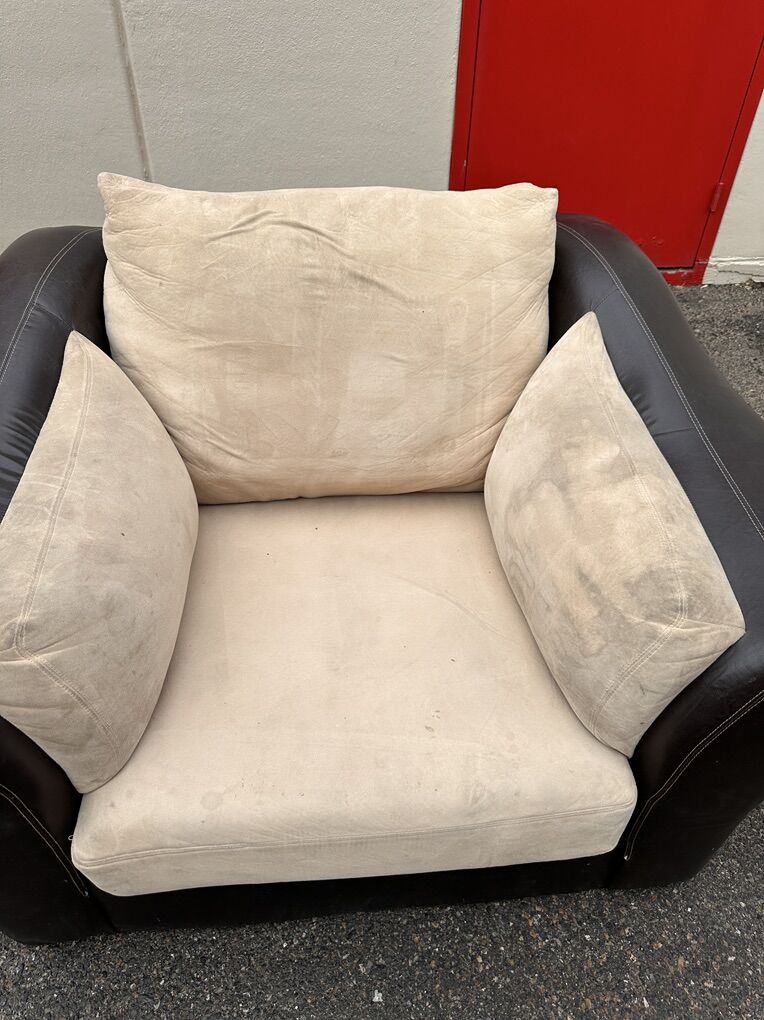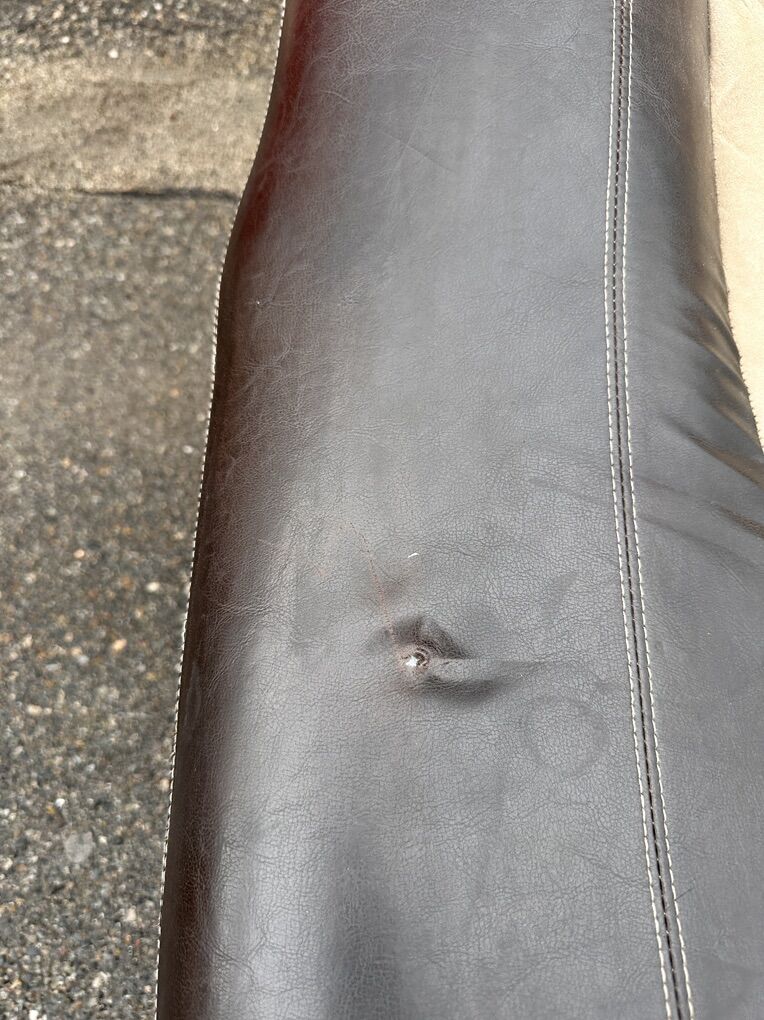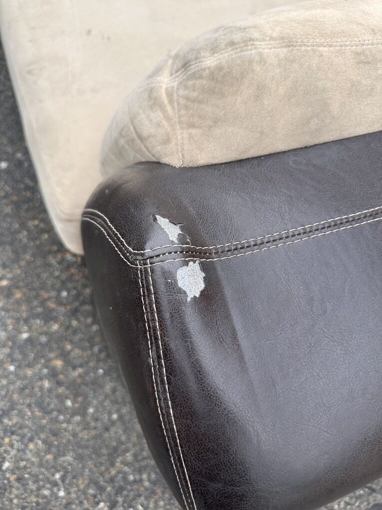 Condition: Structurally solid and very comfortable. Cushions could use a steam clean. Minor peeling and small puncture on arm (see photos).