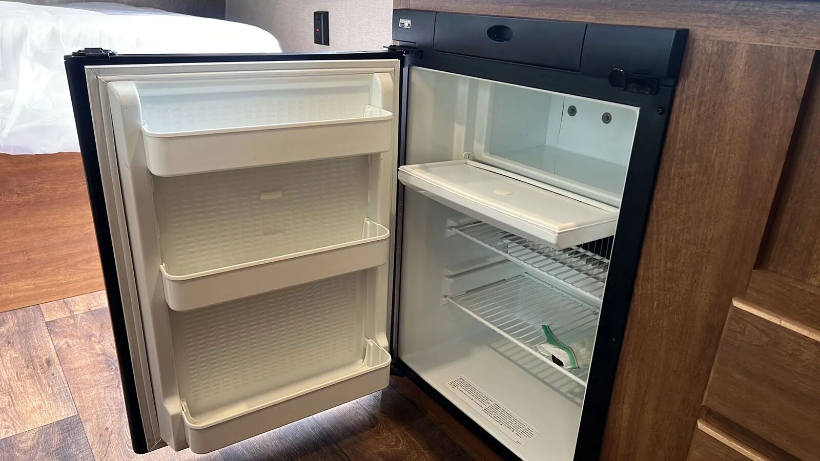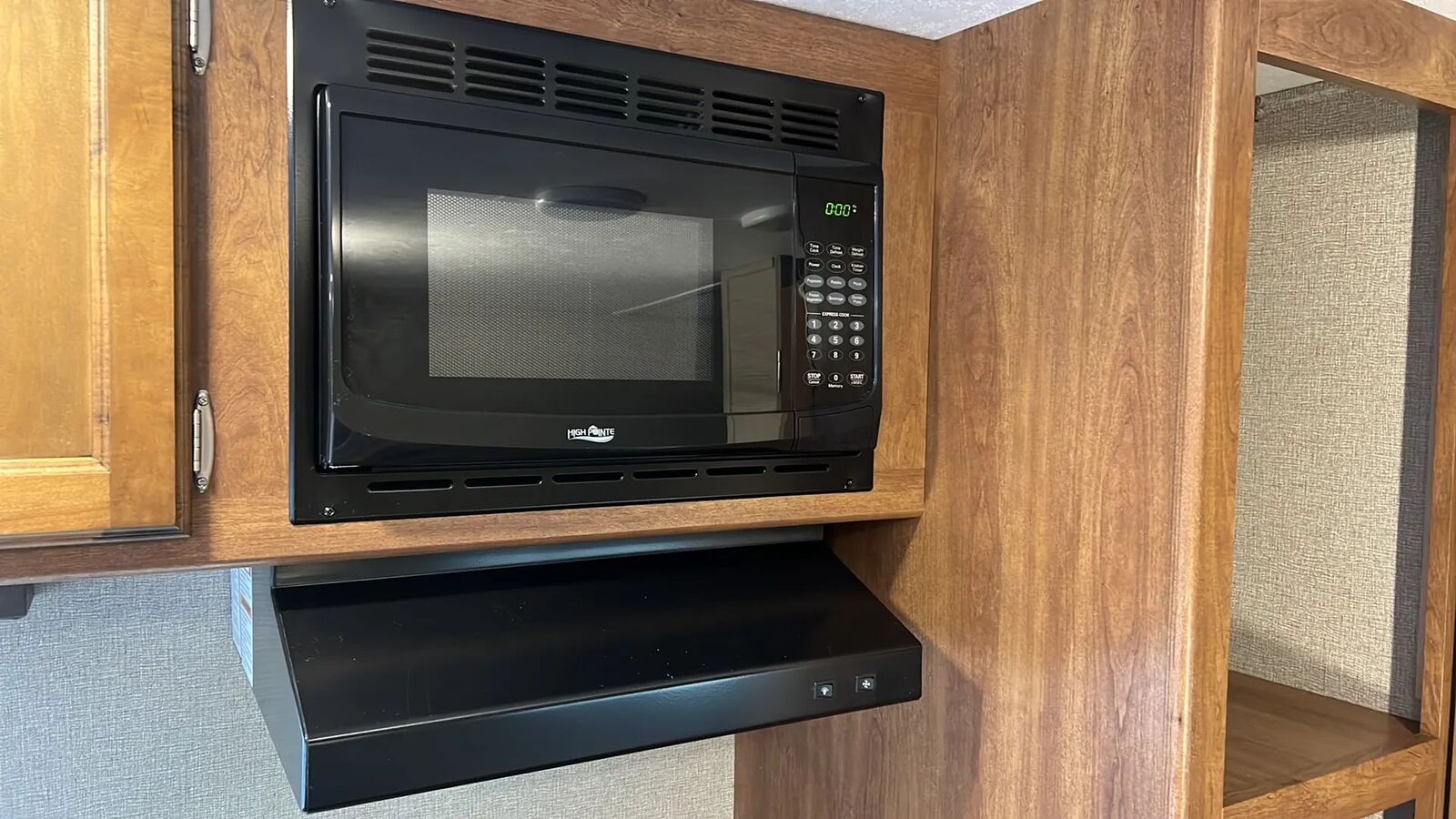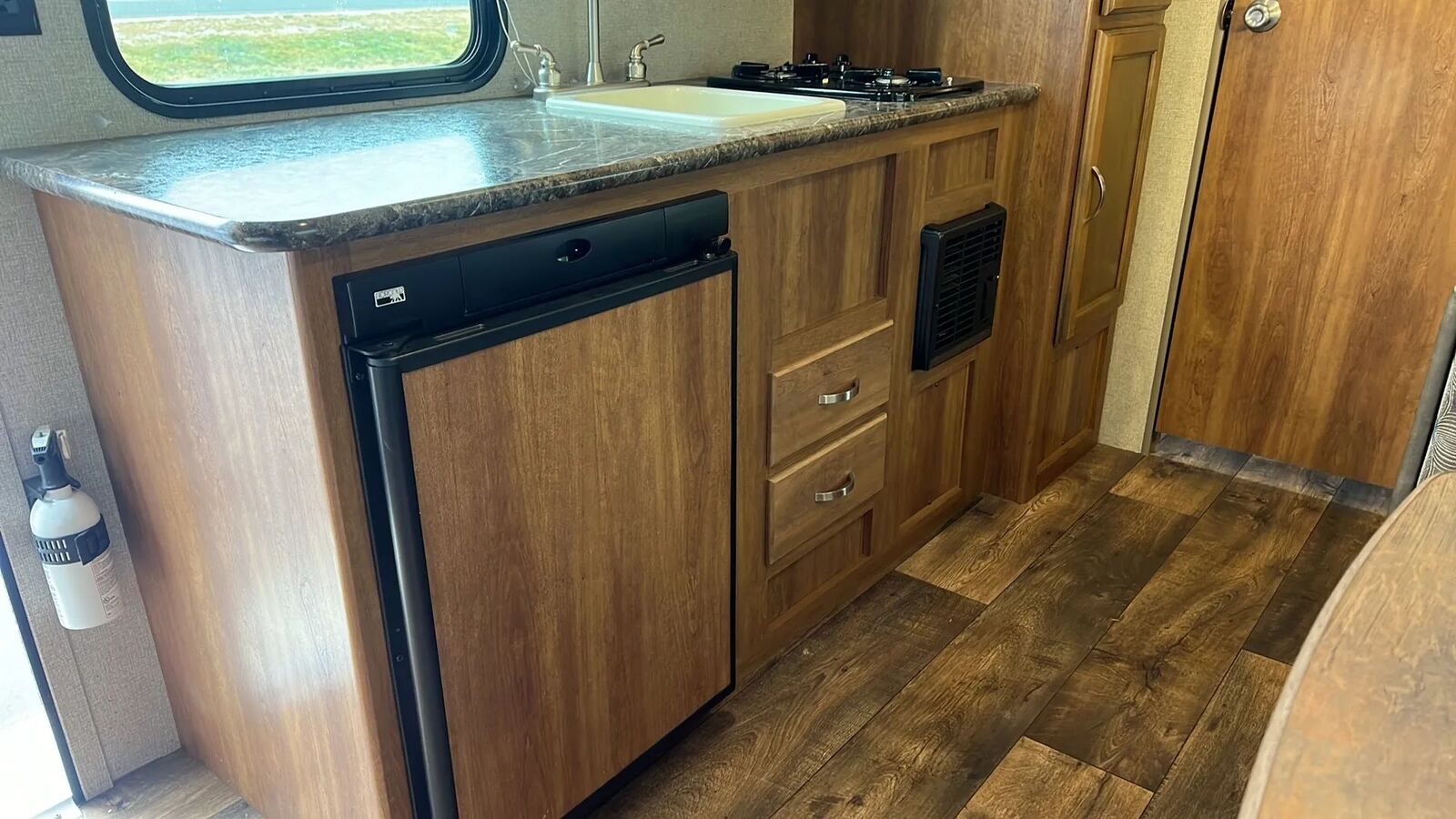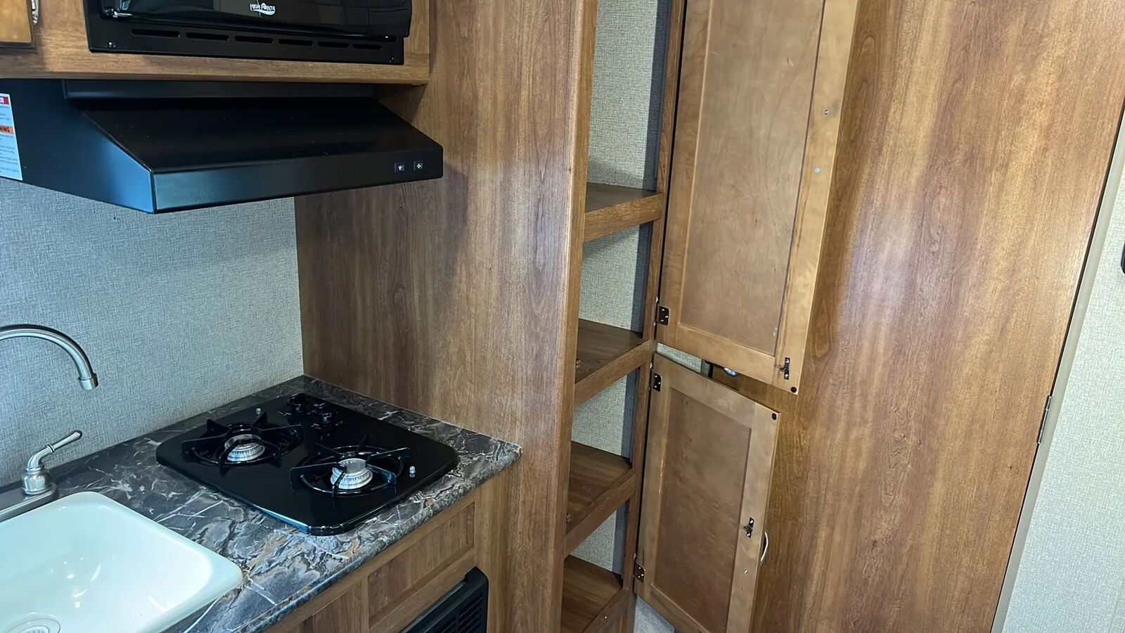 3 cu. ft. refrigerator, 2-burner cooktop, microwave, and a 6-gallon water heater.