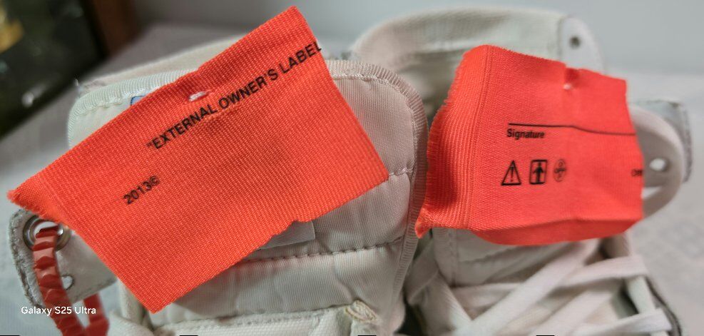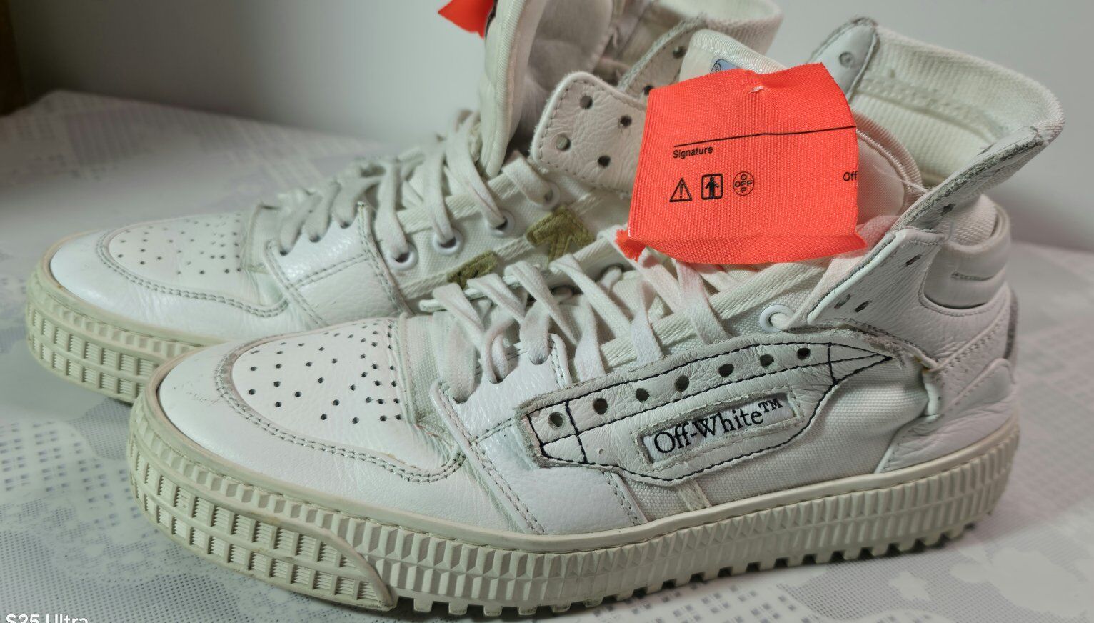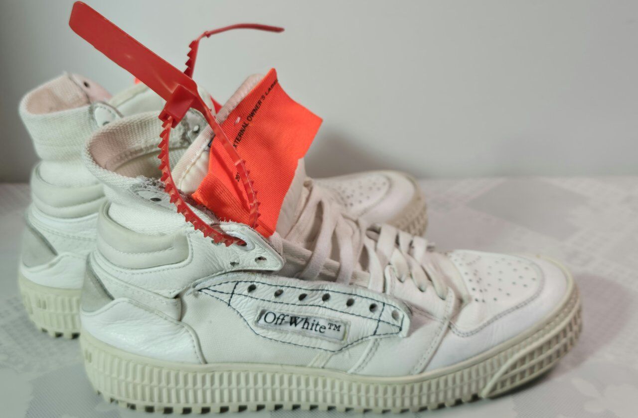 Pre-Owned White OFF-WHITE Trainers T.eu 37 Leather. Off-White C/O Virgil Abloh sneakers, Size 37W High Top "Off-Court" 3.0 model sneakers in white with Off-White ™ logo on the side and orange label. White rubber sole and lace -up closure. See all photos, text message is better, see my other adds, thank you.