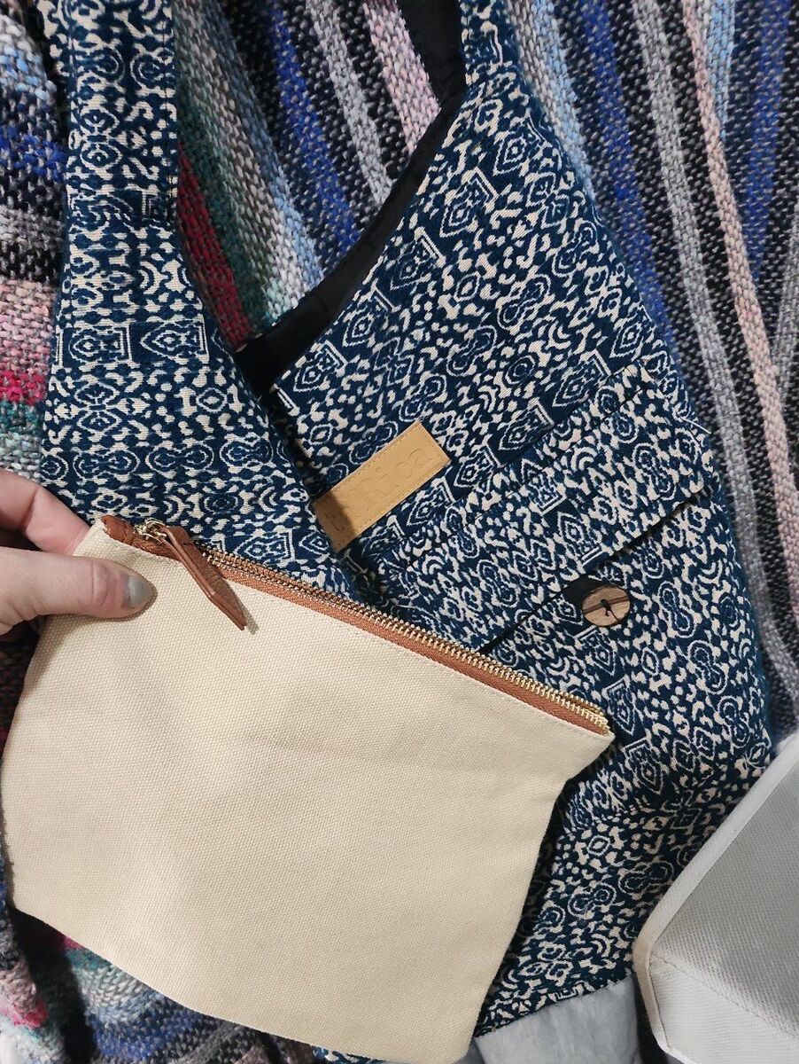 VenmoBeautiful beige and blue crossbody bag paired with a large cream-colored zip pouch, both in great condition.