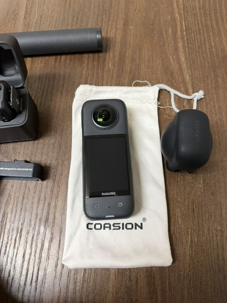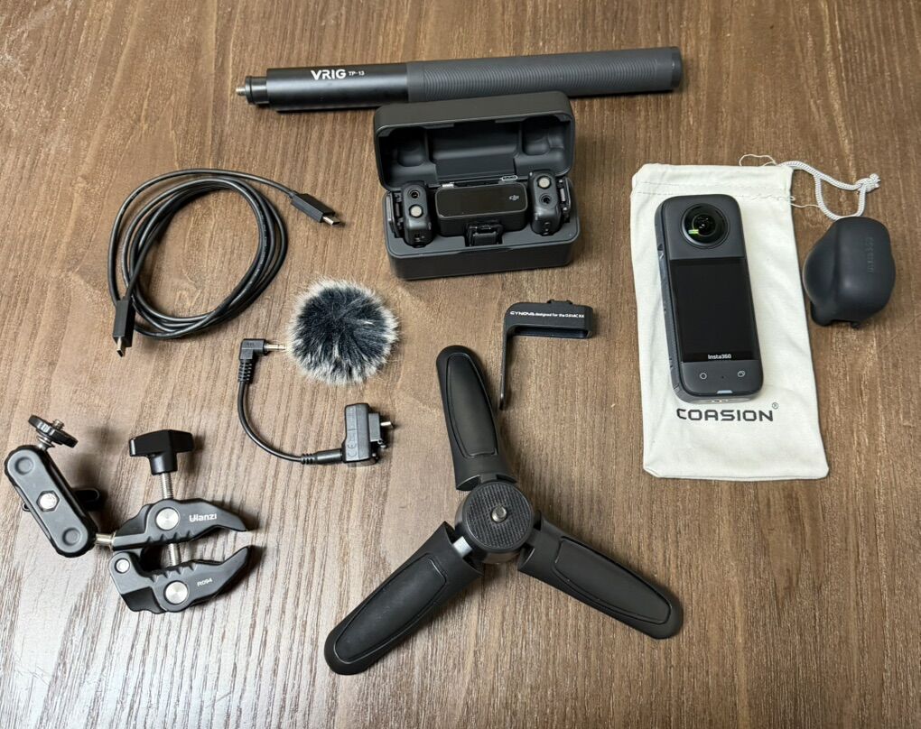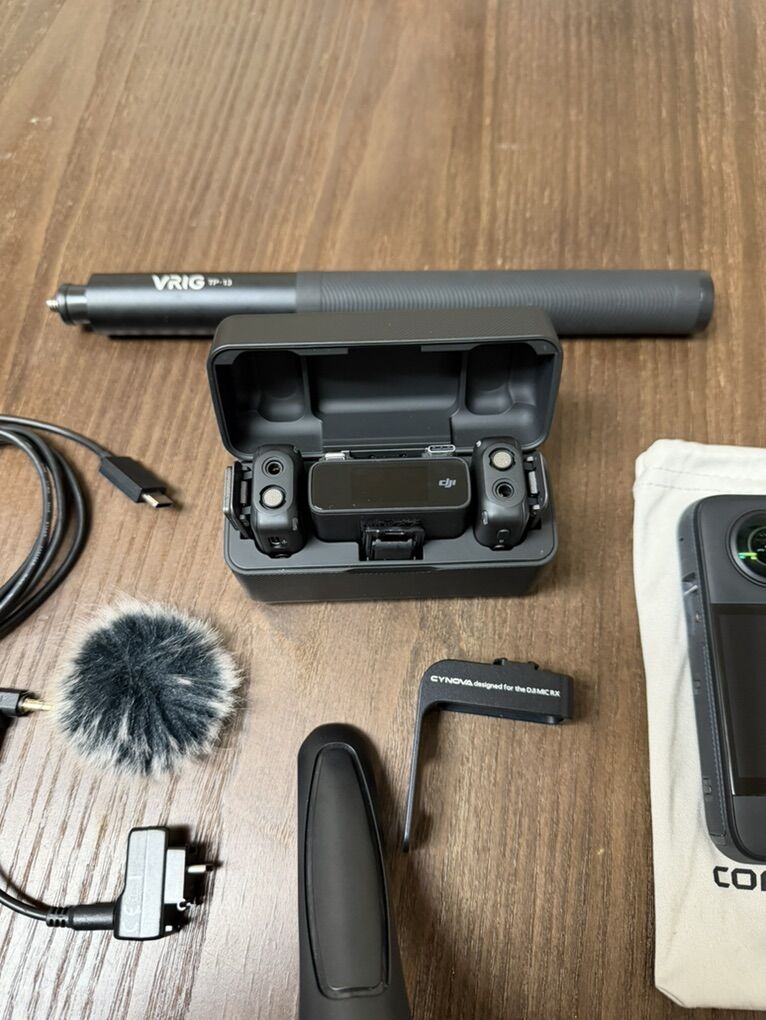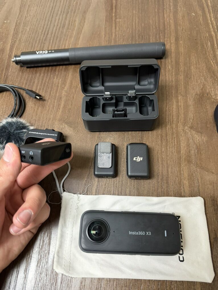 ApplePayComplete kit for sale. Has an Insta360 X3 camera with its silicone cover and pouch. Also includes a DJI Mic wireless microphone system with two transmitters and a receiver in its charging case. Comes with a VRIG TP-13 4.5 foot selfie stick/tripod, a small mini tripod, an Ulanzi R094 super clamp, and a Cynova adapter for the DJI Mic with a furry wind muff. Also has a USB-C cable. Everything you need for content creation!